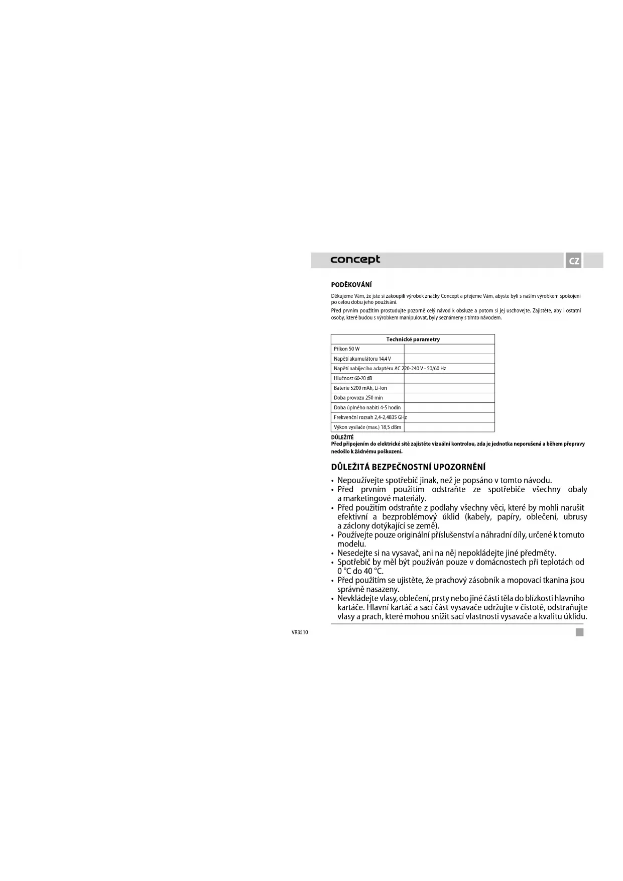 - Plastové sáčky z polyetylénu (PE) odevzdejte do sběrného materiálu k recyklaci. Recyklace spotřebiče na konci jeho životnosti: Tento spotřebič je označen v souladu s Evropskou směrnicí 2012/19/EU o elektrickém odpadu a elektrických zařízeních (WEEE). Symbol na výrobku nebo jeho balení udává, že tento výrobek nepatří do domácího odpadu. Je nutné odvést ho do sběrného místa pro recyklaci elektrického a elektronického zařízení. Zajištěním správné likvidace tohoto výrobku pomůžete zabránit negativním důsledkům pro životní prostředí a lidské zdraví, které by jinak byly způsobeny nevhodnou likvidací tohoto výrobku. Likvidace musí být provedena v souladu s předpisy pro nakládání s odpady. Podrobnější informace orecyklaci tohoto výrobku zjistíte u příslušného místního úřadu, služby pro likvidaci domovního odpadu nebo v obchodě, kde jste výrobek zakoupili. Tento výrobek splňuje veškeré základní požadavky směrnic EU, které se na něj vztahují. Změny v textu, designu a technických specifikací se mohou měnit bez předchozího upozornění a vyhrazujeme si právo na jejich změnu. POĎAKOVANIE Ďakujeme vám, že ste sa rozhodli kúpiť si výrobok značky Concept, a prajeme vám, aby ste boli s naším výrobkom spokojní po celý čas jeho používania. Pred prvým použitím si prosím pozorne preštudujte celý návod naobsluhu a dobre ho odložte. Zabezpečte, aby všetci, ktorí budú tento výrobok používať, boli oboznámení stýmto návodom. Technické parametre Príkon 50 W Napätie akumulátora 14,4 V Napätie nabíjacieho adaptéra AC 220-240 V - 50/60 Hz Hlučnosť 60-70 dB Batéria 5200 mAh, Li-Ion Doba používania 250 min. Doba úplného nabitia 4-5 hodín Frekvenčný rozsah 2,4-2,4835 GHz Výkon vysielača (max.) 18,5 dBm