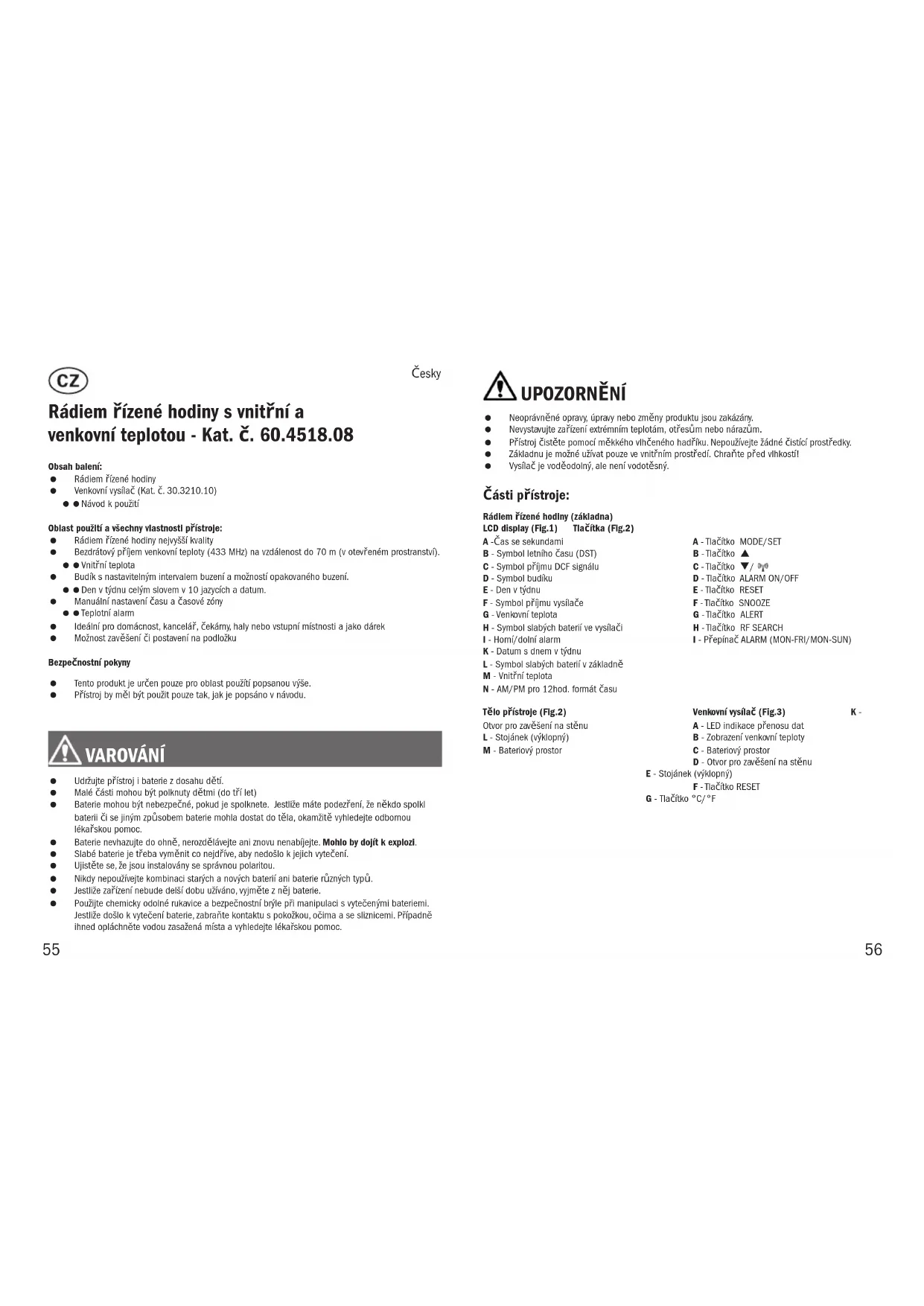 Manuální nastavení Stiskněte a podržte tlačítko MODE/SET (Fig.2-A) na tři sekundy pro vstup do režimu nastavení. První nastavitelná hodnota na displeji bliká. Použíjte tlačítko nebo / pro nastavení. Potvrďte tlačítkem MODE/SET a přejděte na další nastavení. Nastavuje se v tomto pořadí: - Formát času 24/12 (výchozí 24 hod) - Příjem DCF zapnuto/vypnuto (výchozí zapnuto) - Časová zóna -23/+23 (výchozí časová zóna 00 - Jazyk dne v týdnu (výchozí Němčina) - Hodiny, minuty, sekundy (výchozí 00) - Rok, měsíc, den - Jednotka teploty °C/°F (výchozí °C) - Trvání budíku 1 nebo 2 minuty (výchozí 2) Stiskněte a podržte tlačítko nebo / při nastavení pro rychlý posun. Zařízení automaticky ukončí režim nastavení, jestliže není žádné tlačítko stisknuto po dobu 15 sekund. Příjem DCF Ve výchozím nastavení je DCF příjem aktivní (RCC on) a po úspěšném příjmu není třeba prová- dět již ruční nastavení. Jakmile je DCF příjem deaktivován (RCC off), čas a datum musí být nastaveno ručně. Nezobrazu- je se časová zóna. Jestliže dojde opět k nastavení příjmu DCF na RCC on, pak bude ručně nastavený čas přepsán, jakmile dojde k úspěšnému příjmu DCF času. Nastavení časové zóny V režimu nastavení lze změnit nastavení časové zóny. Nastavení časové zóny je nutné v zemích, kde je možné přijmout DCF signál, ale časová zóna je jiná od DCF času (např. +1 = jedna hodina navíc). Jazyk dne v týdnu V režimu nastavení je možné nastavit jazyk pro zobrazení dne v týdnu: němčina (GERMAN), fran- couzština (FRENCH), italština (ITALIAN), španělština (SPANISH), dánština (DANISH), holandština (DUTCH), čeština (CZECH), polština (POLISH), švédština (SWEDISH) a angličtina (ENGLISH).Nastavení času budíku Stiskněte tlačítko MODE/SET (Fig.2-A) v normálním režimu pro nastavení času budíku. Na displeji se objeví ALARMTIME a 7:00 (výchozí) nebo poslední nastavený čas budíku. Stiskněte a podržte tlačítko MODE/SET po dobu tří sekund pro vstup do režimu nastavení. Číslice hodin začne blikat. Stiskněte tlačítko nebo / pro nastavení hodin. Potvrďte nastavení tlačítkem MODE/SET a nastavte stejným způsobem minuty. Stiskněte tlačítko MODE/SET znovu pro návrat do aktuálního času. Pro zapnutí/vypnutí funkce budíku stiskněte tlačítko ALARM ON/OFF (Fig.2-D). Na displeji se zobrazí/zmizí symbol budíku (Fig.1-D). Přepínač na zadní straně umožní zvolit si dva různé budíky (Pondělí – Pátek nebo Pondělí – Neděle) (Fig.2-I). Pokud je funkce budíku zapnutá a je dosaženo nastaveného času, budík začne vyzvánět a ikona budíku se rozbliká. Stiskněte jakékoliv tlačítko (mimo SNOOZE (Fig.2-F)) a budík se vypne. Stiskněte tlačítko SNOOZE (Fig.2-F) pro aktivaci opakovaného buzení. Budík je následně přerušen a opět se spustí za 5 minut. Alarm venkovní teploty Stiskněte a podržte tlačítko ALERT po dobu 3 sekund (Fig.2-G). Na displeji se objeví a 50 °C (výchozí) nebo poslední nastavená hodnota horního teplotního limitu. Stiskněte nebo / pro nastavení horního teplotního limitu. Potvrďte nastavení tlačítkem ALERT. Na displeji se objeví a -20°C (výchozí) nebo poslední nastavená hodnota dolního teplotního limitu. Stiskněte nebo / pro nastavení dolního teplotního limitu. Potvrďte nastavení tlačítkem ALERT. Pro aktivaci/vypnutí funkce alarmu venkovní teploty stiskněte tlačítko ALERT. Na displeji se objeví/zmizí příslušené symboly (Fig.1-I). V případě aktivace alarmu venkovní teploty se příslušné symboly rozblikají a přístroj začně vydávat zvukové znamení. Vypnutí alarmu lze provést pomocí stisku jakéhokoliv tlačítka.