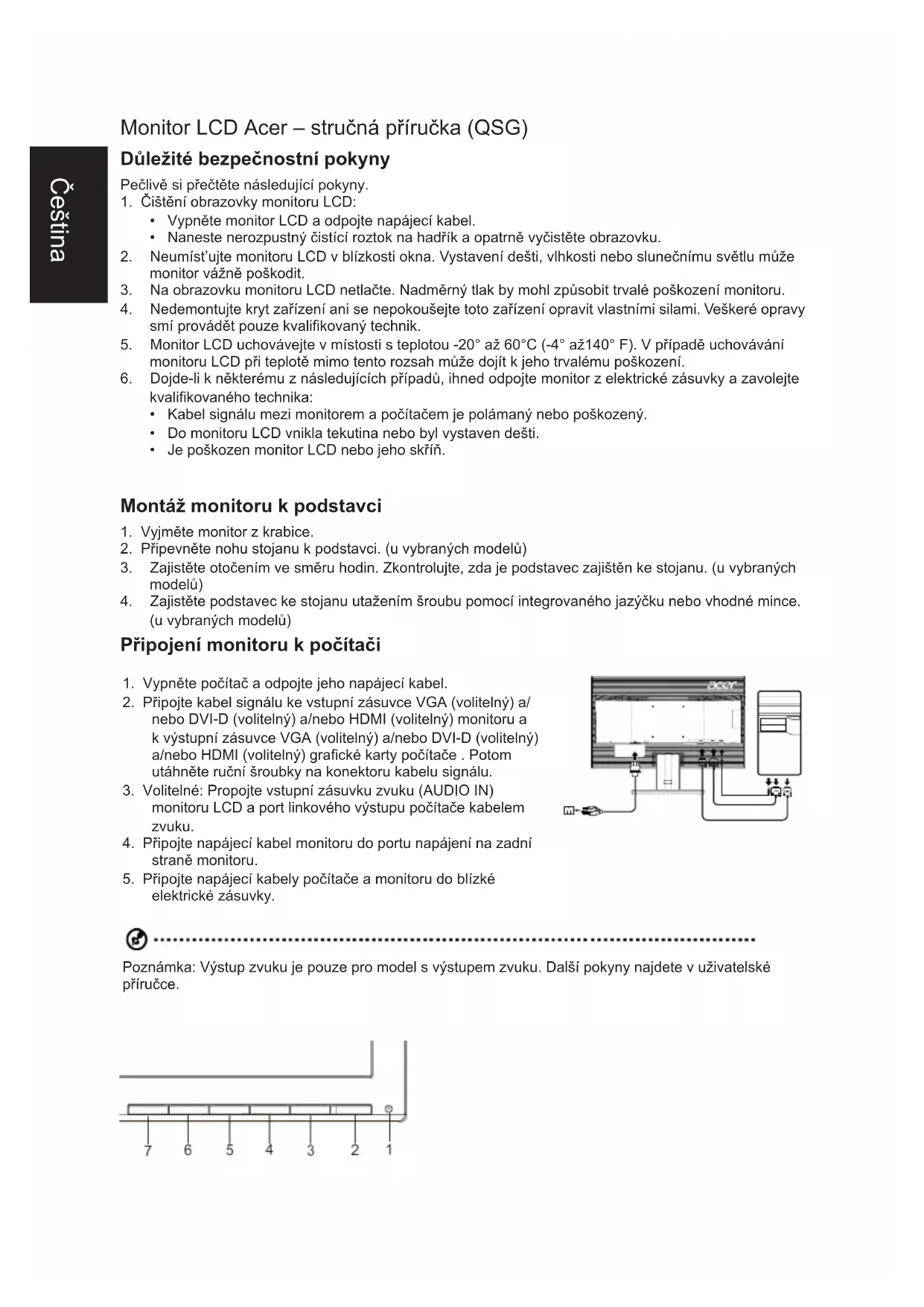 Soustředitse Hodiny Jazyk OSD Timeout Wide Mode DDC / CI ACM Vstup Auto Source Režimrychléhospuštění resetovat Informace *Změnyspecikacíbezpředchozíhoupozorněnívyhrazeny. NávodyadalšídokumentyprosvůjproduktAcernaleznetenaociálníchwebovýchstránkáchpodporyspolečnostiAcer. *Ročníspotřebaenergiesepočításvyužitímtypickéspotřebyenergie4hodinydenně,365dnívroce.Slovenščina Acer LCD Monitor vodič za hitri začetek Pomembne varnostne informacije Pozorno preberite naslednja navodila.