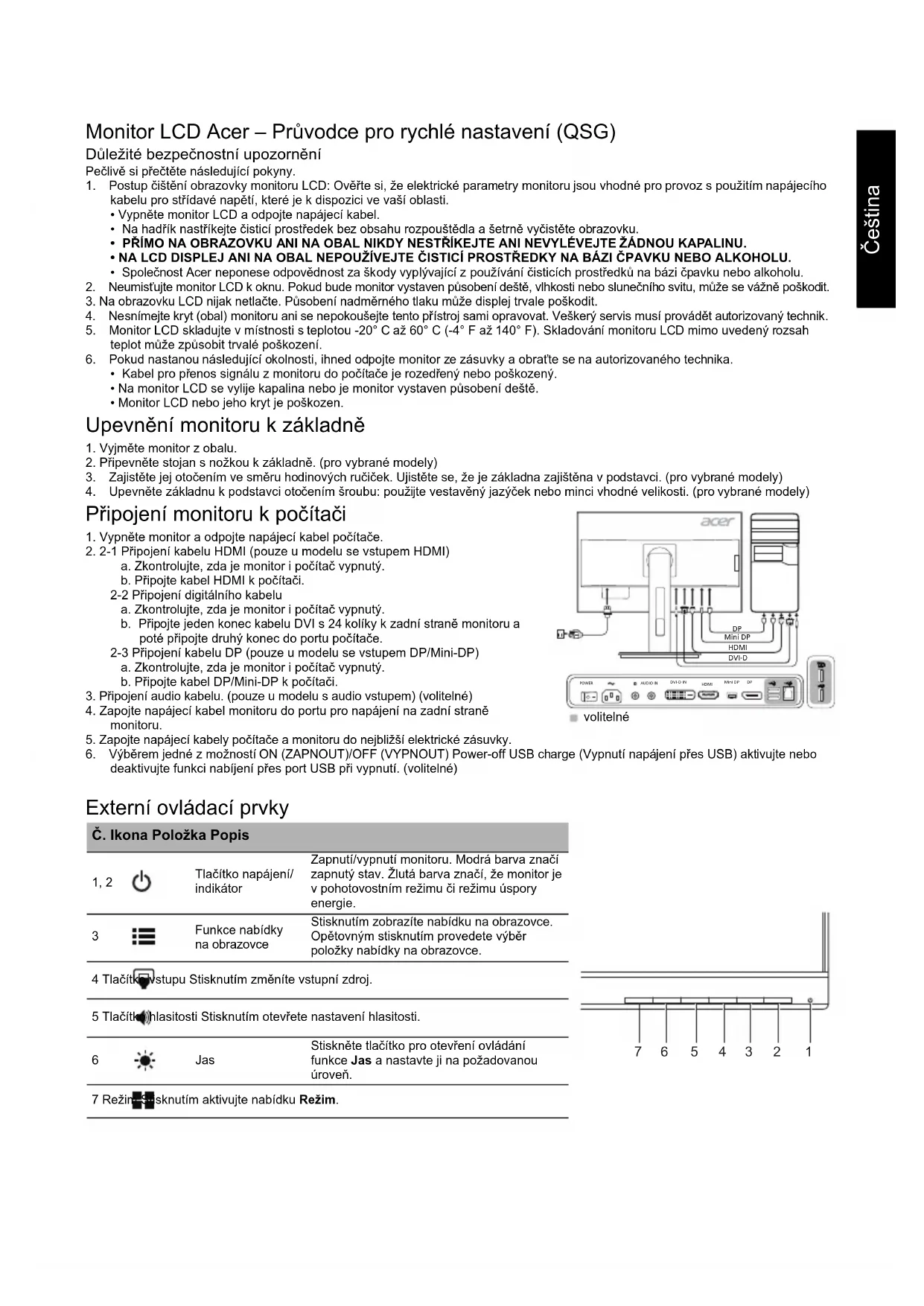 仕様は モ デ ルや地域に よ り異な り ま す。Čeština Monitor LCD Acer – Průvodce pro rychlé nastavení (QSG) Důležité bezpečnostní upozornění Pečlivě si přečtěte následující pokyny. 1. Postup čištění obrazovky monitoru LCD: Ověřte si, že elektrické parametry monitoru jsou vhodné pro provoz s použitím napájecího kabelu pro střídavé napětí, které je k dispozici ve vaší oblasti.• Vypněte monitor LCD a odpojte napájecí kabel.