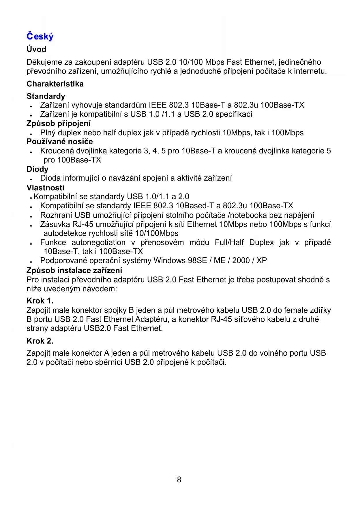 Úvod Děkujeme za zakoupení adaptéru USB 2.0 10/100 Mbps Fast Ethernet, jedinečného převodního zařízení, umožňujícího rychlé a jednoduché připojení počítače k internetu. Charakteristika Standardy z Zařízení vyhovuje standardům IEEE 802.3 10Base-T a 802.3u 100Base-TX z Zařízení je kompatibilní s USB 1.0 /1.1 a USB 2.0 specifikací Způsob připojení z Plný duplex nebo half duplex jak v případě rychlosti 10Mbps, tak i 100Mbps Používané nosiče z Kroucená dvojlinka kategorie 3, 4, 5 pro 10Base-T a kroucená dvojlinka kategorie 5 pro 100Base-TX Diody z Dioda informující o navázání spojení a aktivitě zařízení Vlastnosti z Kompatibilní se standardy USB 1.0/1.1 a 2.0 z Kompatibilní se standardy IEEE 802.3 10Based-T a 802.3u 100Base-TX z Rozhraní USB umožňující připojení stolního počítače /notebooka bez napájení z Zásuvka RJ-45 umožňující připojení k síti Ethernet 10Mbps nebo 100Mbps s funkcí autodetekce rychlosti sítě 10/100Mbps z Funkce autonegotiation v přenosovém módu Full/Half Duplex jak v případě 10Base-T, tak i 100Base-TX z Podporované operační systémy Windows 98SE / ME / 2000 / XP Způsob instalace zařízení Pro instalaci převodního adaptéru USB 2.0 Fast Ethernet je třeba postupovat shodně s níže uvedeným návodem: Krok 1. Zapojit male konektor spojky B jeden a půl metrového kabelu USB 2.0 do female zdířky B portu USB 2.0 Fast Ethernet Adaptéru, a konektor RJ-45 síťového kabelu z druhé strany adaptéru USB2.0 Fast Ethernet. Krok 2. Zapojit male konektor A jeden a půl metrového kabelu USB 2.0 do volného portu USB