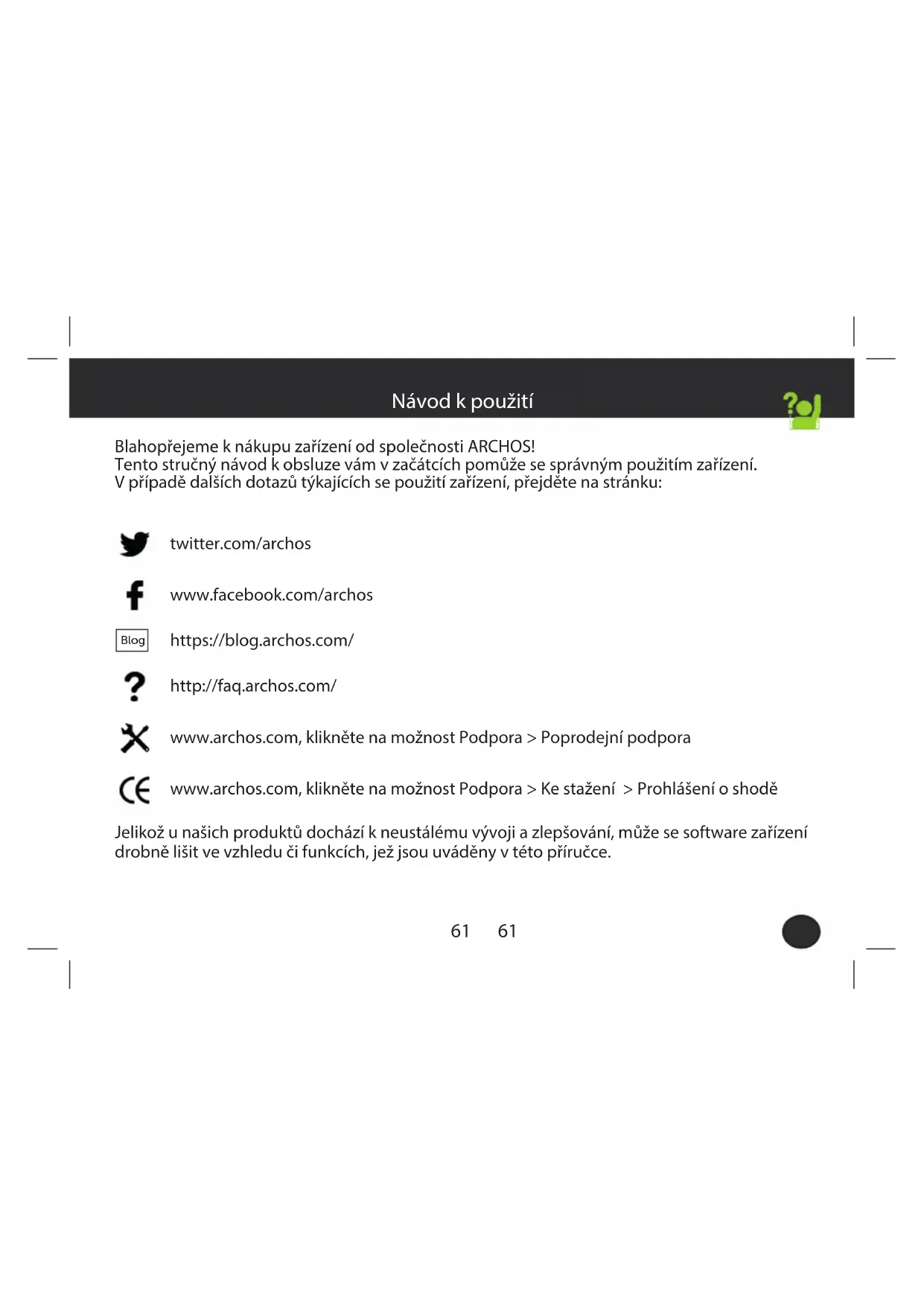Pokud zařízení funguje příliš pomalu: Zavřete veškeré aplikace. Pokud je příjem signálu Wi-Fi příliš slabý: Ujistěte se, že se nenacházíte příliš daleko od Wi-Fi hotspotu. Resetujte a znovu denujte parametry připojení. Kontaktujte svého poskytovatele Wi-Fi připojení Pokud zařízení nefunguje správně: Uveďte zařízení do továrního nastavení. Jděte do menu Nastavení > Zálohování a obnovení dat > Obnovení továrních dat. Nemáte-li z nějakéo důvodu přístup do Nastavení, podívejte se na často kladené dotazy pro informace o jiném postupu obnovy továrních dat. Pokud budete potřebovat další odpovědi týkající se technických problémů, navštivte naši stránku: faq.archos.com67 EN67 SK Pomoc a podpora Blahoželáme vám ku kúpe zariadenia značky ARCHOS! Tento krátky návod vám poradí, ako používať vaše zariadenie správnym spôsobom. Ak máte viac otázok k používaniu zariadenia, navštívte nás na nasledujúcich adresách: twitter.com/archos www.facebook.com/archos Blog https://blog.archos.com/ http://faq.archos.com/ www.archos.com, kliknite na položku Podpora > Popredajná podpora www.archos.com, kliknite na položku Podpora > Súbory na prevzatie > Prehlásenie o zhode Keďže naše zariadenia sa často aktualizujú a vylepšujú, softvér vo vašom zariadení môže mať v porovnaní s týmto krátkym návodom mierne odlišný vzhľad alebo upravené funkcie.68 Warranty INPUT: 5V 2AModel: AC101CR3GMADE IN PRCCore 1013G Obsah balenia ARCHOS Core 101 4G Krátky návod loader Záručné, právne a bezpečnostné upozornenia USB kábel69 INPUT: 5V 2AModel: AC101CR3GMADE IN PRC Core 101