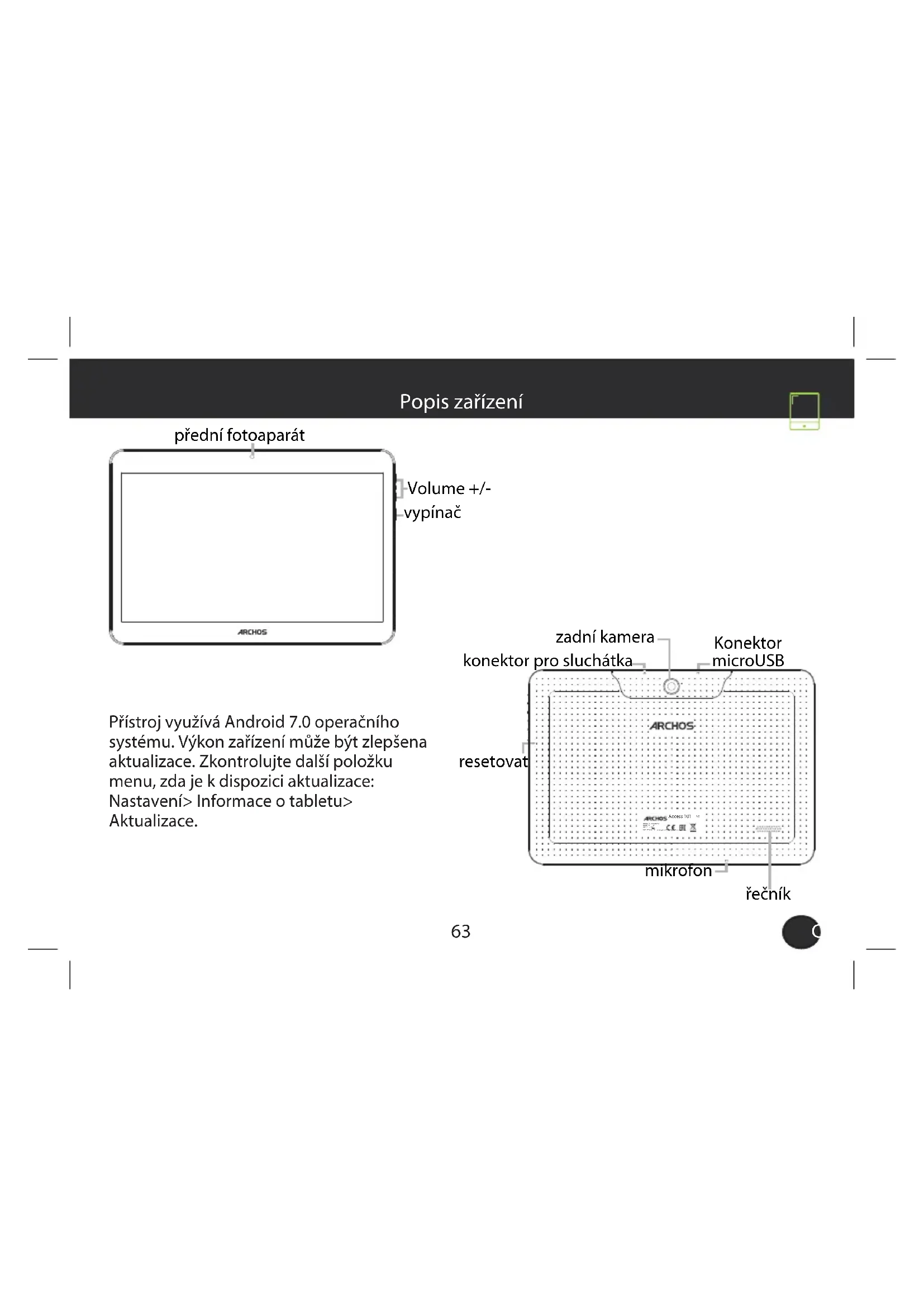 Přistroj vyuzíva Android 7.0 operacniho systému. Vykon zařizení může být zlepsena aktualizace. Zkontrolujte dalí položku menu, zda je k dispozici aktualizace: Nastaveni> Informace o tabletu> Aktualizace.