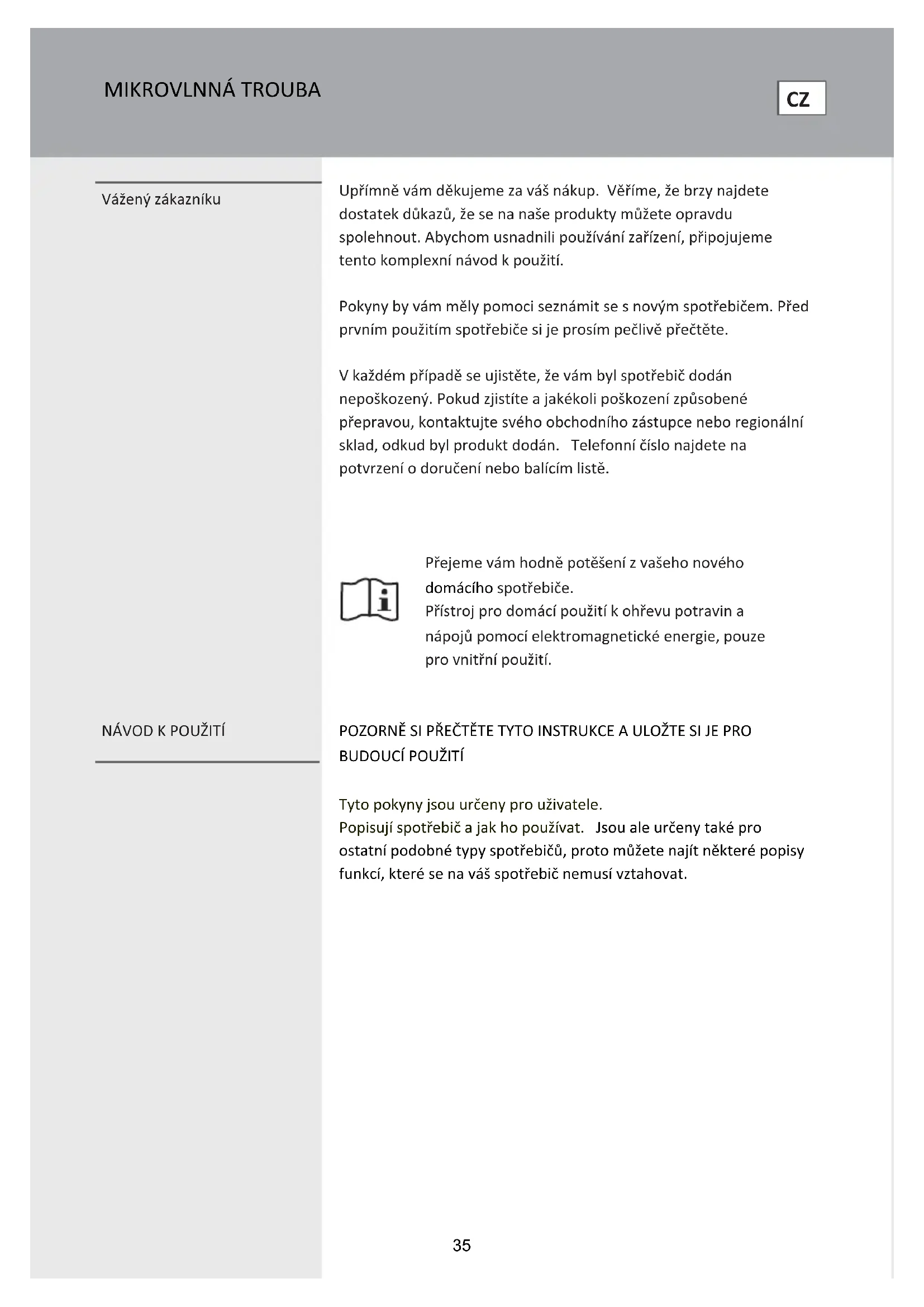 Tyto pokyny jsou určeny pro uživatele. Popisují spotřebič a jak ho používat. Jsou ale určeny také pro ostatní podobné typy spotřebičů, proto můžete najít některé popisy funkcí, které se na váš spotřebič nemusí vztahovat.