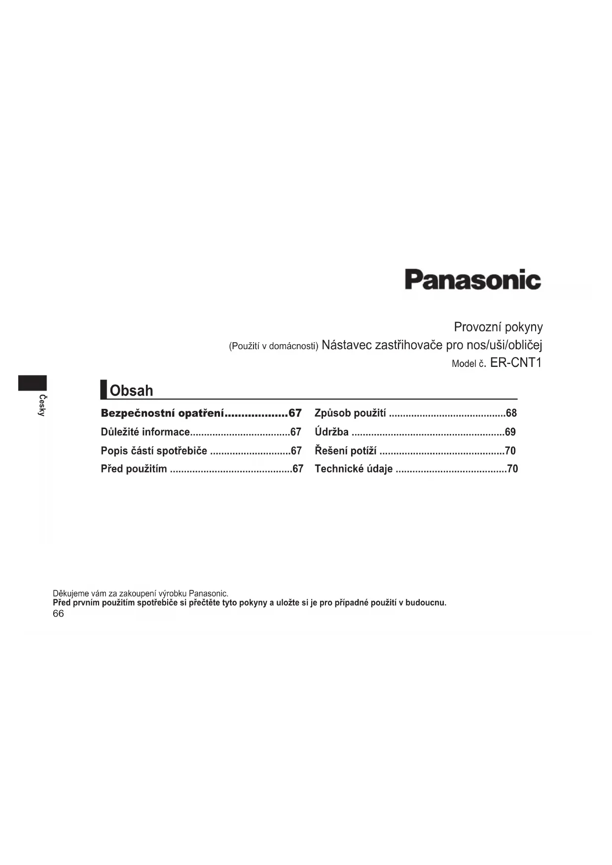 - Vnitřníčepel Odebrat Vnitřníčepelvyjmětevytažením. Montáž Vnitřníčepelzasuňtepřímodovnějšíčepele. Řešenípotíží Problém Akce Řezacívýkonbylsnížen. Vyměňtebřit. Vyčistětevnitřníčepel. Jecítitzvláštnízápach. Čepelsenepohybuje/ neotáčíhladce. Sacívýkonjeslabý. Vyčistětezásobníknaodstřižky. Zavřetepřívodvody. Pokudseproblémystálenedařívyřešit,obraťtesenaprodejcenebo servisnístřediskoautorizovanéspolečnostíPanasonicapožádejteo opravu. Technické údaje Vzduchemšířenýhluk 62 (dB (A) re 1 pW) Tentovýrobekjeurčenvýhradněkpoužitívdomácnosti.71 Slovensky Návod na obsluhu (Domácepoužitie)Nástaveczastrihávačaprechľpkyvnose/ušiach/natvári Modelč. ER‑CNT1 Ďakujeme,žestesikúpilivýrobokznačkyPanasonic. Predpoužívanímtohtoprístrojasivcelomrozsahuprečítajtetentonávodnaobsluhuauschovajtehopremožnúpotrebuvbudúcnosti. Bezpečnostné opatrenia p. 72
