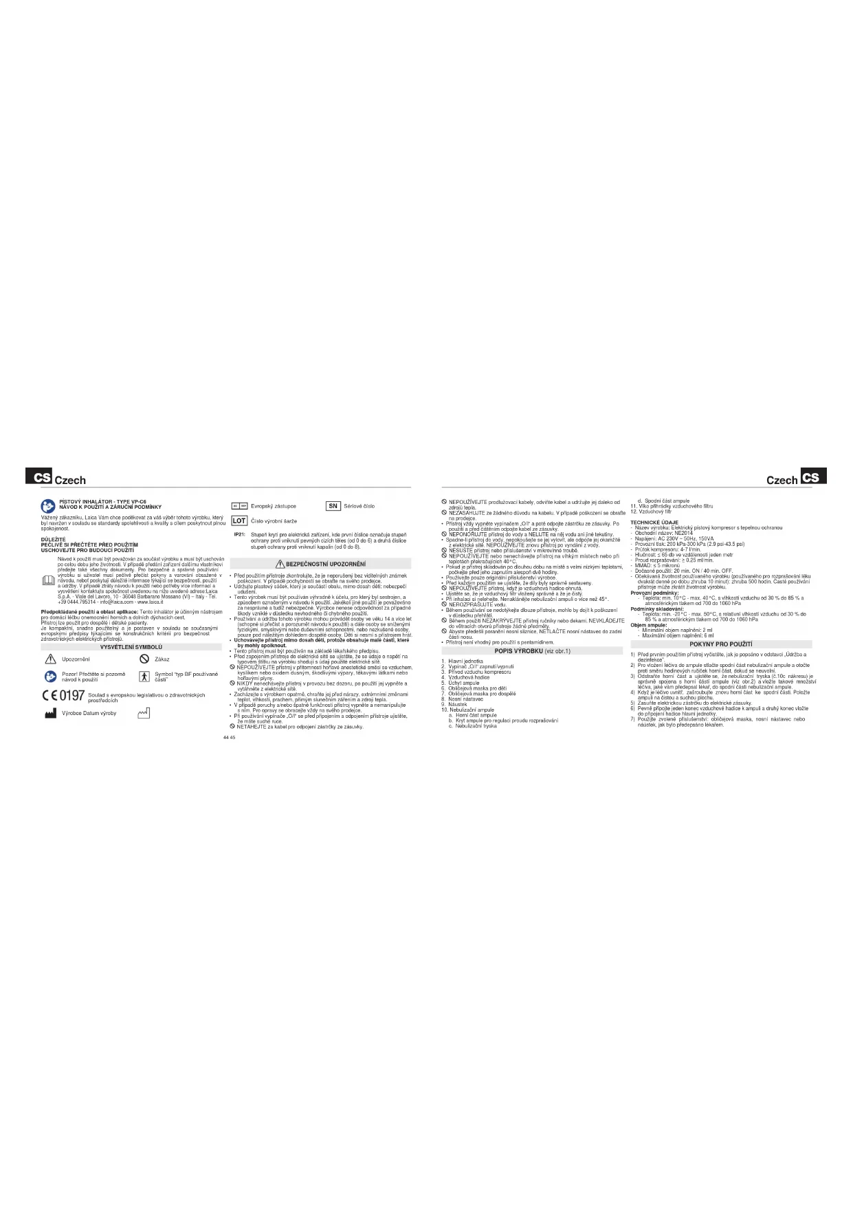 În cazul în care P este puterea maximă în W, d este distanţa minimă de separare în m, iar E este NIVELUL DE TESTARE A IMUNITĂŢII în V/m.OBSERVAŢIE UT este tensiunea de alimentare cu c.a. înainte de aplicarea nivelului de testare.44 45PÍSTOVÝ INHALÁTOR - TYPE VP-C6 NÁVOD K POUŽITÍ A ZÁRUČNÍ PODMÍNKYVážený zákazníku, Laica Vám chce poděkovat za váš výběr tohoto výrobku, který byl navržen v souladu se standardy spolehlivosti a kvality s cílem poskytnout plnou spokojenost.DŮLEŽITÉPEČLIVĚ SI PŘEČTĚTE PŘED POUŽITÍMUSCHOVEJTE PRO BUDOUCÍ POUŽITÍ Návod k použití musí být považován za součást výrobku a musí být uschován po celou dobu jeho životnosti. V případě předání zařízení dalšímu vlastníkovi předejte také všechny dokumenty. Pro bezpečné a správné používání výrobku si uživatel musí pečlivě přečíst pokyny a varování obsažené v návodu, neboť poskytují důležité informace týkající se bezpečnosti, použití a údržby. V případě ztráty návodu k použití nebo potřeby více informací a vysvětlení kontaktujte společnost uvedenou na níže uvedené adrese:Laica S.p.A. - Viale del Lavoro, 10 - 36048 Barbarano Mossano (VI) – Italy - Tel. +39 0444.795314 - info@laica.com - www.laica.it Předpokládané použití a oblast aplikace: Tento inhalátor je účinným nástrojem pro domácí léčbu onemocnění horních a dolních dýchacích cest. Přístroj lze použít pro dospělé i dětské pacienty. Je kompaktní, snadno použitelný a je postaven v souladu se současnými evropskými předpisy týkajícími se konstrukčních kritérií pro bezpečnost zdravotnických elektrických přístrojů.VYSVĚTLENÍ SYMBOLŮUpozorněníZákaz Pozor! Přečtěte si pozorně návod k použitíSymbol “typ BF používané částí”Soulad s evropskou legislativou o zdravotnických prostředcíchVýrobce Datum výrobyEvropský zástupce Sériové číslo LOT Číslo výrobní šaržeIP21:Stupeň krytí pro elektrická zařízení, kde první číslice označuje stupeň ochrany proti vniknutí pevných cizích těles (od 0 do 6) a druhá číslice stupeň ochrany proti vniknutí kapalin (od 0 do 8). BEZPEČNOSTNÍ UPOZORNĚNÍ• Před použitím přístroje zkontrolujte, že je neporušený bez viditelných známek poškození. V případě pochybností se obraťte na svého prodejce.• Udržujte plastový sáček, který je součástí obalu, mimo dosah dětí: nebezpečí udušení.• Tento výrobek musí být používán výhradně k účelu, pro který byl sestrojen, a způsobem označeným v návodu k použití. Jakékoli jiné použití je považováno za nesprávné a tudíž nebezpečné. Výrobce nenese odpovědnost za případné škody vzniklé v důsledku nevhodného či chybného použití.• Používání a údržbu tohoto výrobku mohou provádět osoby ve věku 14 a více let (schopné si přečíst a porozumět návodu k použití) a dále osoby se sníženými fyzickými, smyslovými nebo duševními schopnostmi, nebo nezkušené osoby, pouze pod náležitým dohledem dospělé osoby. Děti si nesmí s přístrojem hrát.• Uchovávejte přístroj mimo dosah dětí, protože obsahuje malé části, které by mohly spolknout.• Tento přístroj musí být používán na základě lékařského předpisu.• Před zapojením přístroje do elektrické sítě se ujistěte, že se údaje o napětí na typovém štítku na výrobku shodují s údaji použité elektrické sítě. NEPOUŽÍVEJTE přístroj v přítomnosti hořlavé anestetické směsi se vzduchem, kyslíkem nebo oxidem dusným, škodlivými výpary, těkavými látkami nebo hořlavými plyny. NIKDY nenechávejte přístroj v provozu bez dozoru, po použití jej vypněte a vytáhněte z elektrické sítě.• Zacházejte s výrobkem opatrně, chraňte jej před nárazy, extrémními změnami teplot, vlhkostí, prachem, přímým slunečním zářením a zdroji tepla.• V případě poruchy a/nebo špatné funkčnosti přístroj vypněte a nemanipulujte s ním. Pro opravy se obracejte vždy na svého prodejce.• Při používání vypínače „O/I“ se před připojením a odpojením přístroje ujistěte, že máte suché ruce. NETAHEJTE za kabel pro odpojení zástrčky ze zásuvky. NEPOUŽÍVEJTE prodlužovací kabely, odviňte kabel a udržujte jej daleko od zdrojů tepla. NEZASAHUJTE ze žádného důvodu na kabelu. V případě poškození se obraťte na prodejce.• Přístroj vždy vypněte vypínačem „O/I“ a poté odpojte zástrčku ze zásuvky. Po použití a před čištěním odpojte kabel ze zásuvky. NEPONOŘUJTE přístroj do vody a NELIJTE na něj vodu ani jiné tekutiny.• Spadne-li přístroj do vody, nepokoušejte se jej vylovit, ale odpojte jej okamžitě z elektrické sítě. NEPOUŽÍVEJTE znovu přístroj po vyndání z vody. NESUŠTE přístroj nebo příslušenství v mikrovlnné troubě. NEPOUŽÍVEJTE nebo nenechávejte přístroj na vlhkým místech nebo při teplotách překračujících 40°C.• Pokud je přístroj skladován po dlouhou dobu na místě s velmi nízkými teplotami, počkejte před jeho zapnutím alespoň dvě hodiny.• Používejte pouze originální příslušenství výrobce.• Před každým použitím se ujistěte, že díly byly správně sestaveny. NEPOUŽÍVEJTE přístroj, když je vzduchová hadice ohnutá.• Ujistěte se, že je vzduchový filtr vložený správně a že je čistý.• Při inhalaci si nelehejte. Nenaklánějte nebulizační ampuli o více než 45°. NEROZPRAŠUJTE vodu.• Během používání se nedotýkejte dlouze přístroje, mohlo by dojít k poškození v důsledku přehřátí. Během použití NEZAKRÝVEJTE přístroj ručníky nebo dekami. NEVKLÁDEJTE do větracích otvorů přístroje žádné předměty. Abyste předešli poranění nosní sliznice, NETLAČTE nosní nástavec do zadní části nosu.• Přístroj n