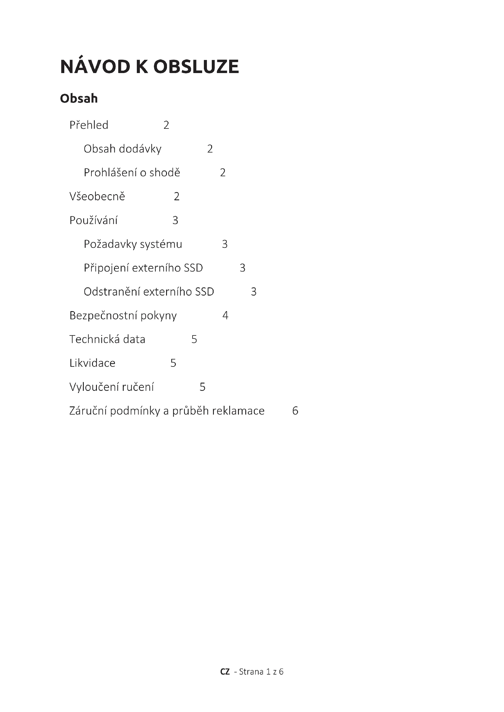 INTENSO INTERNATIONAL GMBH I Service Center (o seu número RMA) Kopernikusstraße 12-14 I D-49377 VechtaNÁVOD K OBSLUZE CZ - Strana 1 z 6 Obsah Přehled 2 Obsahdodávky 2 Prohlášeníoshodě 2 Všeobecně 2 Používání 3 Požadavkysystému 3 PřipojeníexterníhoSSD 3 OdstraněníexterníhoSSD 3 Bezpečnostnípokyny 4 Technickádata 5 Likvidace 5 Vyloučeníručení 5 Záručnípodmínkyaprůběhreklamace 6CZ-Strana2z6 Přečtětesipečlivětentonávodarespektujtevšechnypokynyuvedenévtomtonávodu,abyse zaručiladlouhodobáživotnostaspolehlivépoužívánípřístroje.Uschovejtetentonávodnadosah rukyaodevzdejtejejjinýmuživatelůmpřístroje. K tomuto návodu VŠEOBECNĚ Prohlášení o shodě SymbolCEprokazuje,žetentoproduktsplňujepožadavkyvšechsměrnicEU protentoprodukt. Obsah dodávky PŘEHLED HlavníúkoltohotoexterníhoSSDspočívávukládánídatzpočítačů,notebooků,ultrabookůnebo počítačůMAC.Tentoproduktnenínaplánovanýkekomerčnímupoužívánínebonamedicínské aspeciálníúčely,přikterýchmůževýpadekproduktuzpůsobitzranění,smrtelnéúrazynebo výraznévěcnéškody. Vpřípaděpoužívání,kteréneodpovídápoužívánípodlepředpisů,zanikázáruka. Otevřeníataképřestavbapřístrojeapoužívánípřídavnýchpřístrojůadílůpříslušenství,které nebylyschválenénašírmou,jsouzakázány. NepoužívejteexterníSSDzaextrémníchokolníchpodmínekarespektujtebezpečnostnípředpisy. Nerespektováníinformacíabezpečnostníchpokynůvtomtonávodusepovažujezanedodržování používánípodlepředpisůamůževéstkzánikuzárukyazraněnímosobnebověcnýmškodám. Používání podle předpisů
