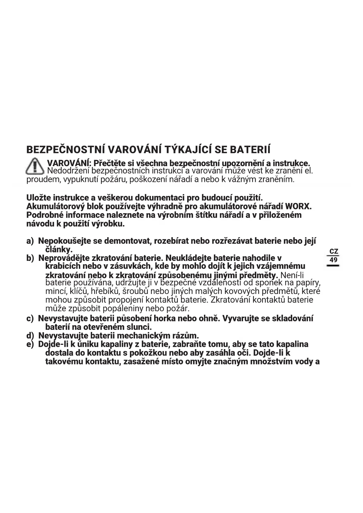 17.Nabijejte pouze baterie stejného typu, jaky je dodáván společností Worx a modely doporučné společností Worx.