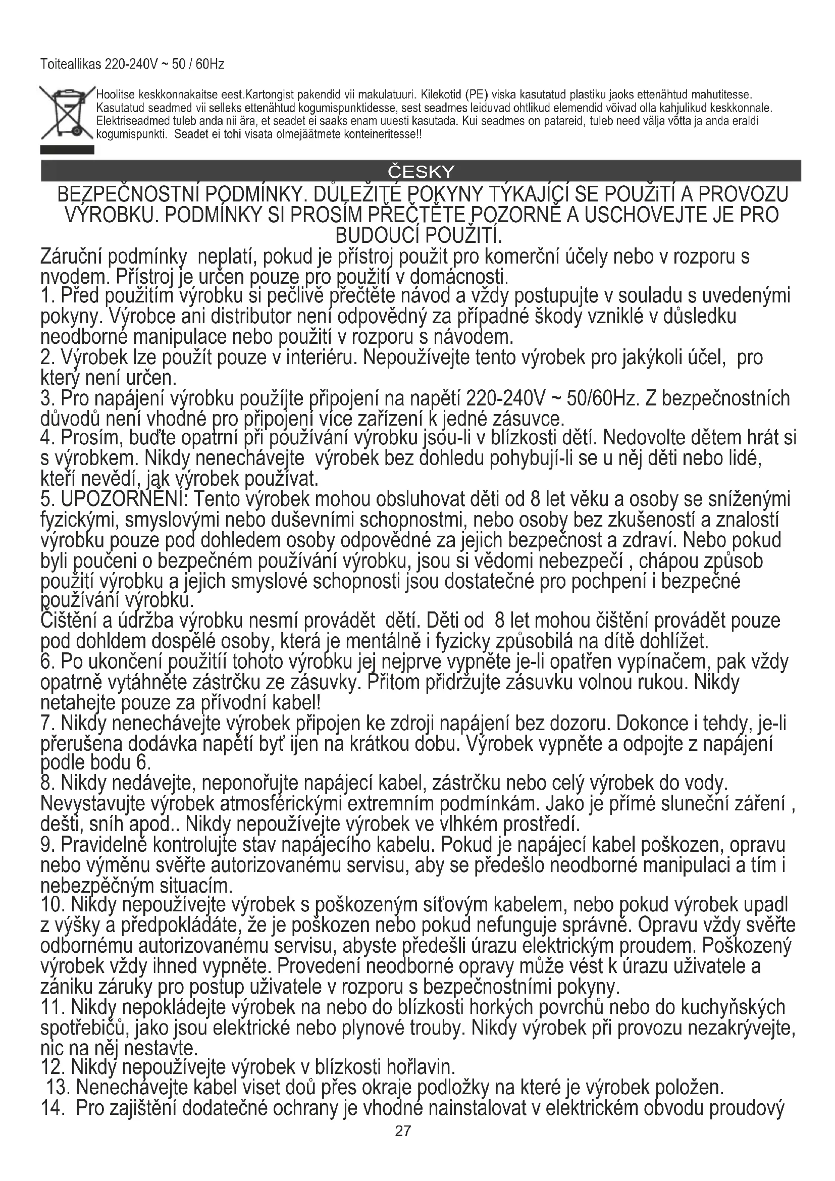 6. Pokud nebudete spotřebič delší dobu používat, musí být chráněn před nadměrným množstvím prachu a nečistot. Skladujte ohřívač na suchém místě mimo dosah slunečních paprsků a nečistot. TECHNICKÉ ÚDAJE Výkon 1 500 W. Napájení 220-240V ~ 50 / 60Hz Ochrana životního prostředí. Kartón odevzdejte do sběru. Polyetylénové sáčky (PE) vyhazujte do kontejneru na plasty. Vysloužilý přístroj odevzdejte do příslušného sběrného dvoru, protože některé části zařízení mohou představovat pro životní prostředí nebezpečí. Elektrický přístroj odevzdejte tak, aby se omezilo jeho opětovné používání. Pokud jsou v přístroji baterie, vyjměte je a odevzdejte do příslušného sběrného místa zvlášť. Přístroj nevyhazujte do popelnic ani kontejneru na směsný odpad!! MAGYAR A BIZTONSÁGRA VONATKOZÓ FONTOS UTASÍTÁSOK OLVASSA EL FIGYELMESEN, ÉS