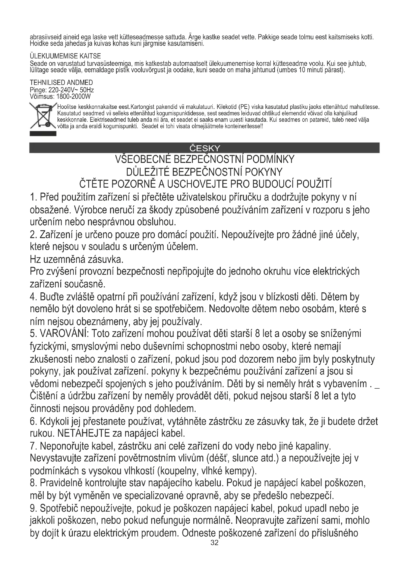 Zařízení je vybaveno bezpečnostním systémem, který v případě přehřátí automaticky vypne napájení ohřívače. Pokud k této události dojde, vypněte zařízení, vytáhněte zástrčku ze zásuvky a počkejte, dokud zařízení nevychladne (asi po 10 minutách). TECHNICKÁ DATA Napětí: 220-240V~ 50Hz Výkon: 1800-2000W Ochrana životního prostředí. Kartón odevzdejte do sběru. Polyetylénové sáčky (PE) vyhazujte do kontejneru na plasty. Vysloužilý přístroj odevzdejte do příslušného sběrného dvoru, protože některé části zařízení mohou představovat pro životní prostředí nebezpečí. Elektrický přístroj odevzdejte tak, aby se omezilo jeho opětovné používání. Pokud jsou v přístroji baterie, vyjměte je a odevzdejte do příslušného sběrného místa zvlášť. Přístroj nevyhazujte do popelnic ani kontejneru na směsný odpad!! MAGYAR