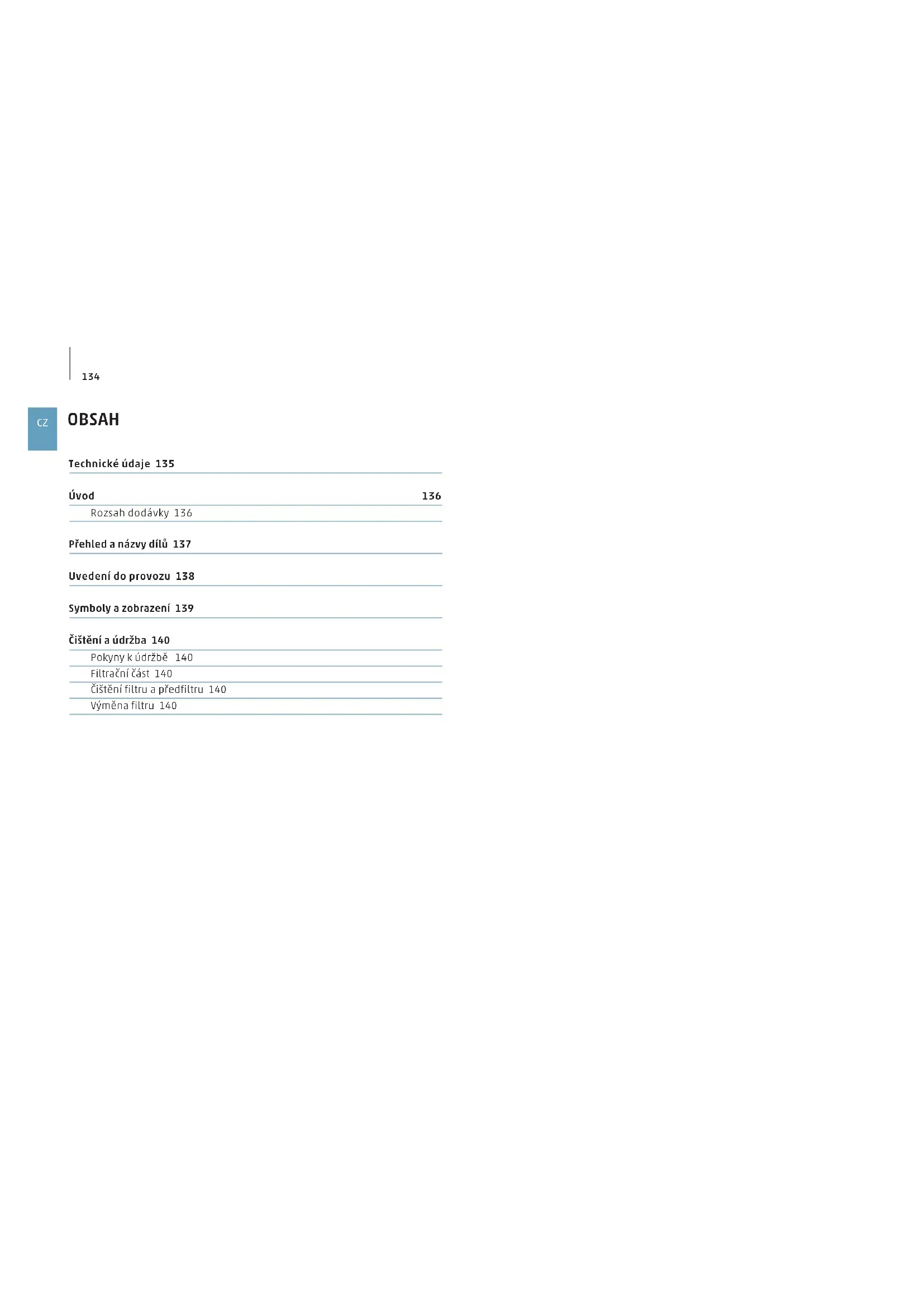 OBSAH Technické údaje 135 Úvod 136 Rozsah dodávky 136 Přehled anázvy dílů 137 Uvedení do provozu 138 Symboly azobrazení 139 Čištění aúdržba 140 Pokyny kúdržbě 140 Filtrační část 140 Čištění filtru apředfiltru 140 Výměna filtru 140135