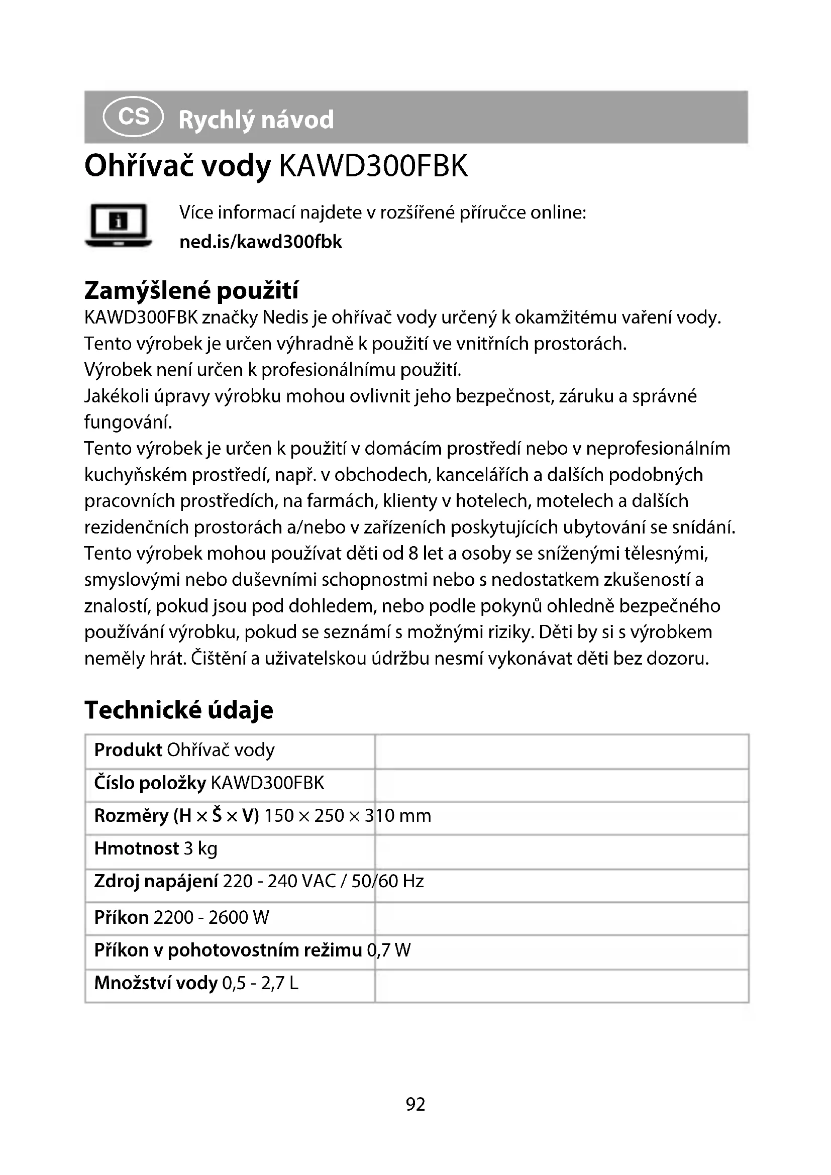 Rychlý návod Ohřívač vody KAWD300FBK Více informací najdete v rozšířené příručce online: ned.is/kawd300fbk Zamýšlené použití KAWD300FBK značky Nedis je ohřívač vody určený kokamžitému vaření vody. Tento výrobek je určen výhradně k použití ve vnitřních prostorách. Výrobek není určen k profesionálnímu použití. Jakékoli úpravy výrobku mohou ovlivnit jeho bezpečnost, záruku a správné fungování. Tento výrobek je určen kpoužití vdomácím prostředí nebo v neprofesionálním kuchyňském prostředí, např. v obchodech, kancelářích a dalších podobných pracovních prostředích, na farmách, klienty v hotelech, motelech a dalších rezidenčních prostorách a/nebo v zařízeních poskytujících ubytování se snídání. Tento výrobek mohou používat děti od 8 let a osoby se sníženými tělesnými, smyslovými nebo duševními schopnostmi nebo s nedostatkem zkušeností a znalostí, pokud jsou pod dohledem, nebo podle pokynů ohledně bezpečného používání výrobku, pokud se seznámí s možnými riziky. Děti by si s výrobkem neměly hrát. Čištění a uživatelskou údržbu nesmí vykonávat děti bez dozoru. Technické údaje Produkt Ohřívač vody Číslo položky KAWD300FBK Rozměry (H × Š × V) 150 × 250 × 310mm Hmotnost 3kg Zdroj napájení 220 - 240 VAC / 50/60 Hz Příkon 2200 - 2600 W Příkon v pohotovostním režimu 0,7 W Množství vody 0,5 - 2,7 L KAWD300FBK_MAN_COMP_0520_print_(20160 1422)_v00.01.indd 92KAWD300FBK_MAN_COMP_0520_print_(20160 1422)_v00.01.indd 92 03-06-2020 08:2703-06-2020 08:2793 Hlavní části (obrázek A)
