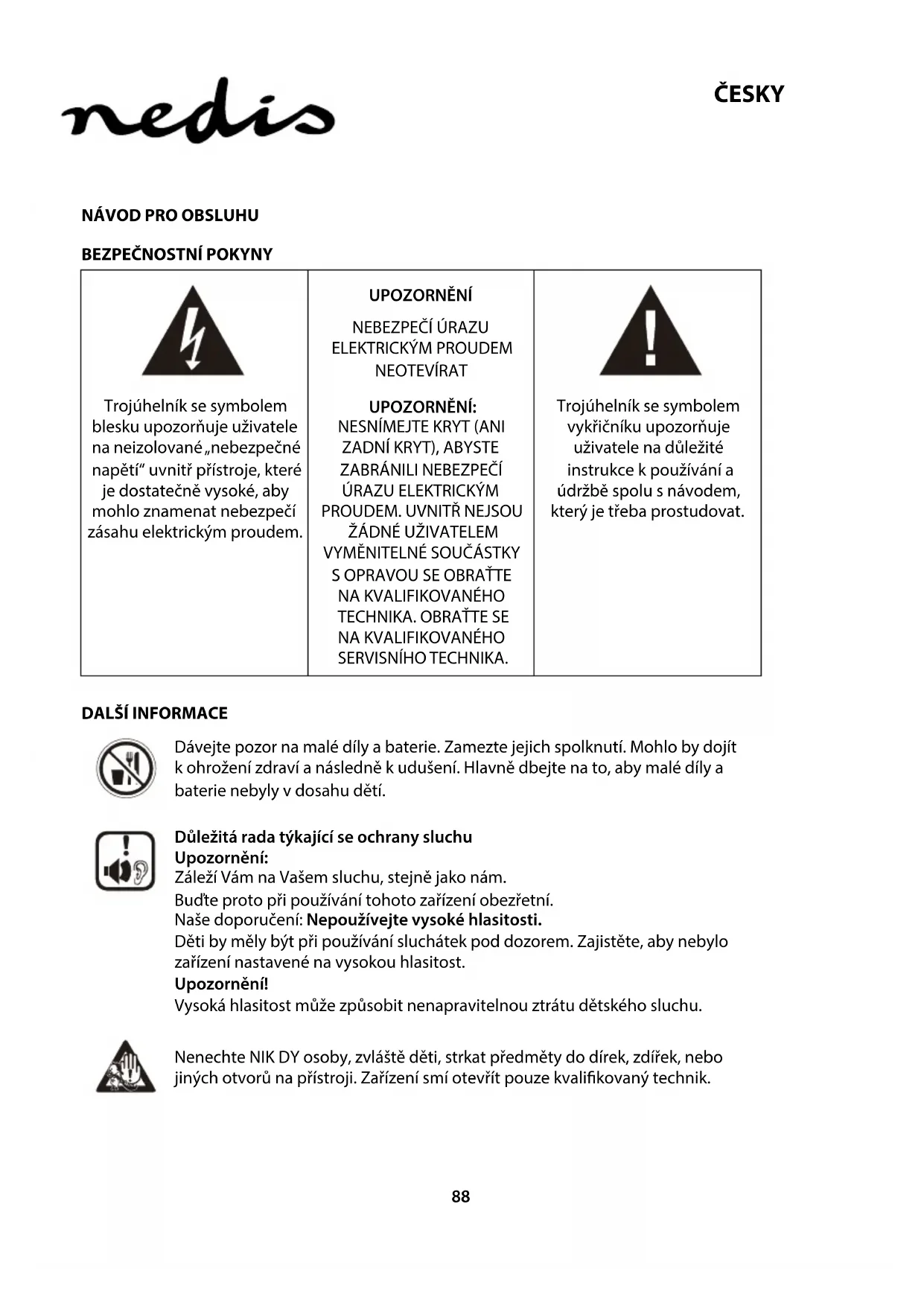SERVISNÍHO TECHNIKA. Trojúhelník se symbolem vykřičníku upozorňuje uživatele na důležité instrukce k používání a údržbě spolu s návodem, který je třeba prostudovat. DALŠÍ INFORMACE Dávejte pozor na malé díly a baterie. Zamezte jejich spolknutí. Mohlo by dojít kohrožení zdraví a následně kudušení. Hlavně dbejte na to, aby malé díly a baterie nebyly v dosahu dětí. Důležitá rada týkající se ochrany sluchu Upozornění: Záleží Vám na Vašem sluchu, stejně jako nám. Buďte proto při používání tohoto zařízení obezřetní. Naše doporučení: Nepoužívejte vysoké hlasitosti. Děti by měly být při používání sluchátek pod dozorem. Zajistěte, aby nebylo zařízení nastavené na vysokou hlasitost. Upozornění! Vysoká hlasitost může způsobit nenapravitelnou ztrátu dětského sluchu. Nenechte NIK DY osoby, zvláště děti, strkat předměty do dírek, zdířek, nebo jiných otvorů na přístroji. Zařízení smí otevřít pouze kvalikovaný technik.89 ČESKY Zařízení používejte pouze kjeho danému účelu. Toto zařízení se smí používat pouze vdomácnostech a remních prostorech. Uschovejte tento návod kpozdějšímu nahlédnutí. Pokyny kochraně životního prostředí Nelikvidujte tento výrobek na konci jeho životního cyklu spolu sběžným domovním odpadem. Odevzdejte jej ve sběrném dvoře pro recyklaci elektrických a elektronických zařízení. Způsob likvidace je uveden pomocí symbolu na výrobku, vnávodu kobsluze a na balení. Materiály jsou recyklovatelné, jak je uvedeno i na označení. Recyklací, recyklací materiálu nebo jinými způsoby využití starých zařízení významně přispíváte kochraně životního prostředí. Informace o příslušných sběrných dvorech vám poskytnou místní úřady. Nebraňte ventilaci vzduchu. Zajistěte, aby ventilační systém zařízení nebyl blokován záclonami, novinami, nábytkem ani jinými typy předmětů. Ventilační systém nesmí nikdy blokovat žádné předměty! Přehřátí zařízení by mohlo vést kvážnému poškození a snížit jeho výkon a životnost. Horko a teplo Zařízení nevystavujte přímému slunečnímu světlu. Zajistěte, aby zařízení nebylo vystaveno přímému zdroji tepla, jako je topení nebo otevřený oheň. Kontrolujte, zda nejsou zakryty ventilační otvory zařízení. Vlhkost a čištění Toto zařízení není voděodolné! Neponořujte jej do vody. Zabraňte kontaktu zařízení svodou. Pokud by voda pronikla dovnitř zařízení, mohla by způsobit vážné poškození. Nepoužívejte abrazivní prostředky ani čisticí prostředky obsahující alkohol, amoniak nebo benzín. Mohlo by dojít kpoškození zařízení. Kčištění zařízení použijte měkký navlhčený hadřík. Odborná recyklace Baterie a obalový materiál nepatří do domácího odpadu. Baterie musí být vráceny do speciální sběrny pro použité baterie. Separací nevratných obalových materiálů šetříte životní prostředí.