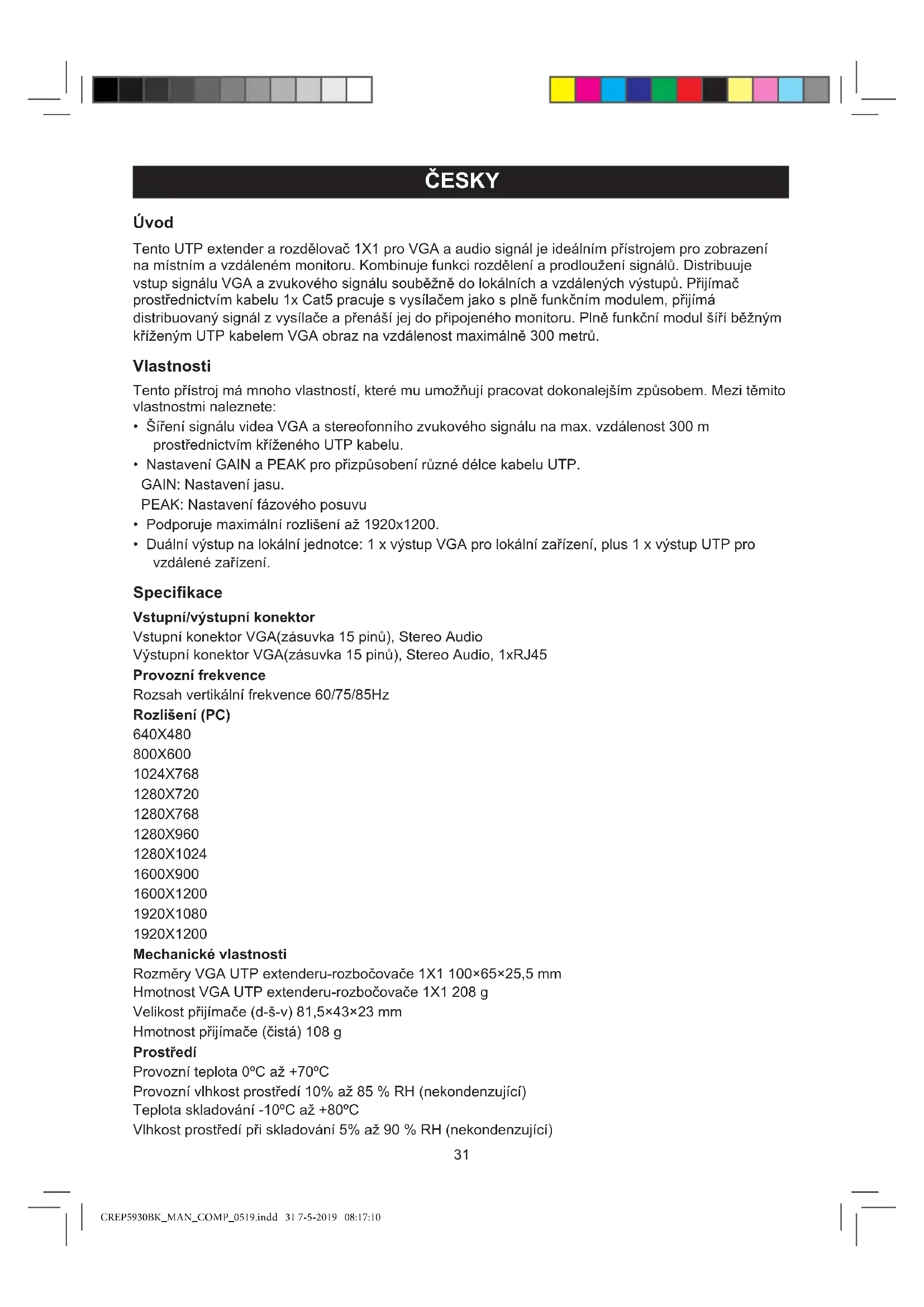 ÖPPNA INTE VARNING CREP5930BK_MAN_COMP_0519.indd 30 7-5-2019 08:17:0931 ČESKY Úvod Tento UTP extender a rozdělovač 1X1 pro VGA a audio signál je ideálním přístrojem pro zobrazení na místním a vzdáleném monitoru. Kombinuje funkci rozdělení a prodloužení signálů. Distribuuje vstup signálu VGA a zvukového signálu souběžně do lokálních a vzdálených výstupů. Přijímač prostřednictvím kabelu 1x Cat5 pracuje s vysílačem jako s plně funkčním modulem, přijímá distribuovaný signál z vysílače a přenáší jej do připojeného monitoru. Plně funkční modul šíří běžným kříženým UTP kabelem VGA obraz na vzdálenost maximálně 300 metrů. Vlastnosti Tento přístroj má mnoho vlastností, které mu umožňují pracovat dokonalejším způsobem. Mezi těmito vlastnostmi naleznete: