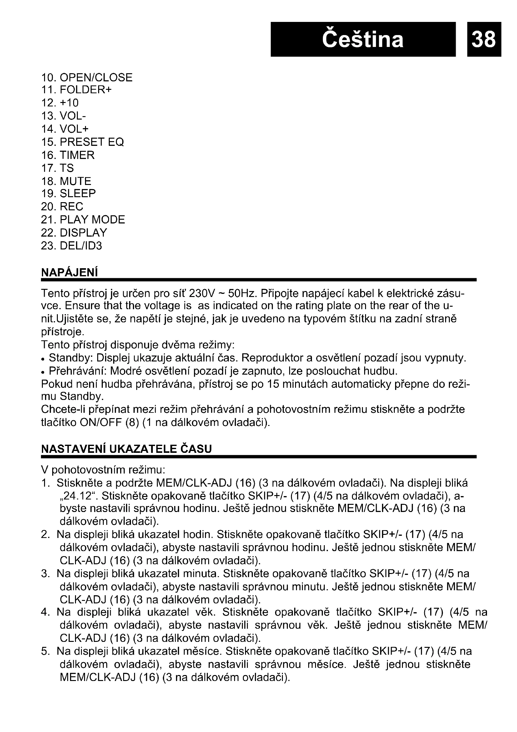- Na displeji blíká ukazatel hodin. Stisknéte opakované tlacítko SKIP+/- (17) (4/5 na dálkovém ovladači), abyste nastavili správnou hodinu. Ještě Jednou stisknéte MEM/ CLK-ADJ (16) (3 na dálkovém ovladači).
