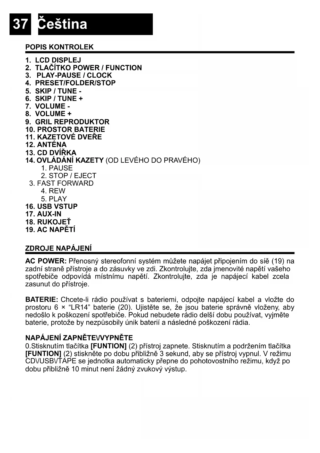 AC POWER: Přenosný stereofonní systém můžete napájet připojením do síě (19) na zadní straně přístroje a do zásuvky ve zdi. Zkontrolujte, zda jmenovité napětí vašeho spotřebiče odpovídá místnímu napětí. Zkontrolujte, zda je napájecí kabel zcela zasunut do přístroje. BATERIE: Chcete-li rádio používat s bateriemi, odpojte napájecí kabel a vložte do prostoru 6 × “LR14” baterie (20). Ujistěte se, že jsou baterie správně vloženy, aby nedošlo k poškození spotřebiče. Pokud nebudete rádio delší dobu používat, vyjměte baterie, protože by nezpůsobily únik baterií a následné poškození rádia.