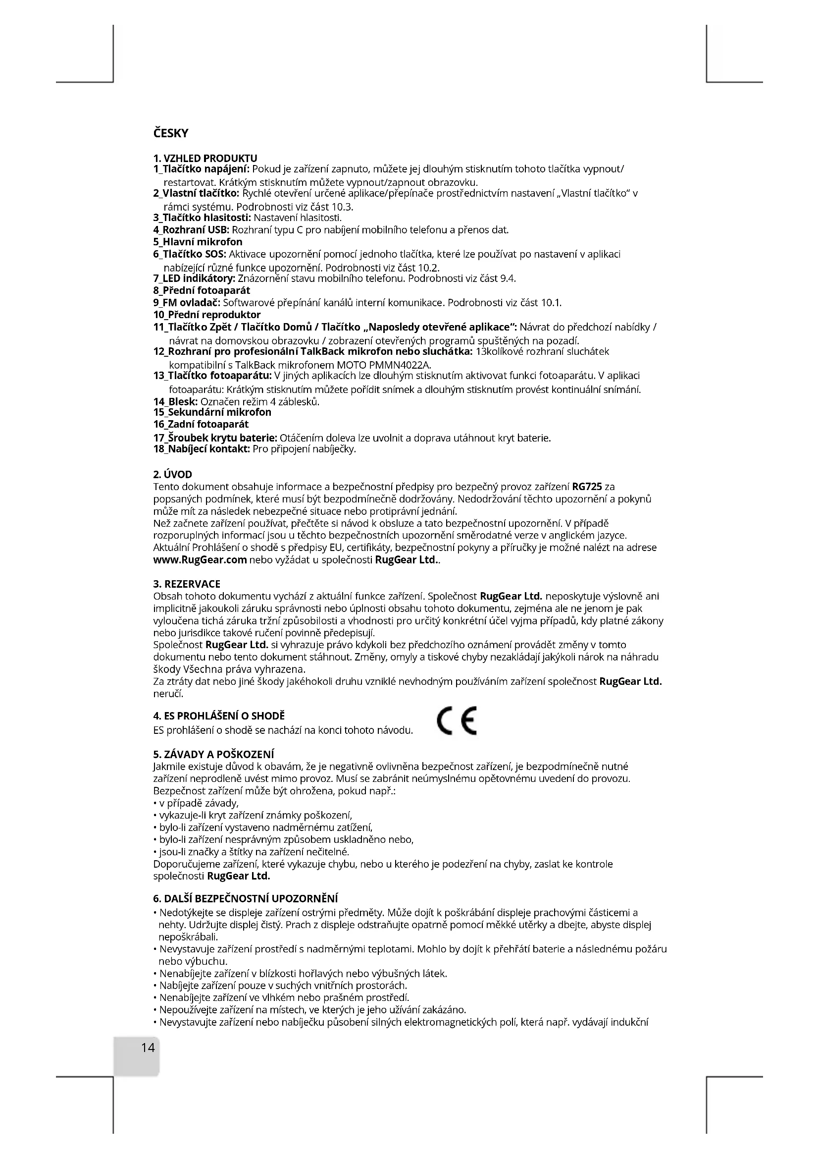 Tento dokument obsahuje informace a bezpečnostní předpisy pro bezpečný provoz zařízení RG725 za popsaných podmínek, které musí být bezpodmínečně dodržovány. Nedodržování těchto upozornění a pokynů může mít za následek nebezpečné situace nebo protiprávní jednání. Než začnete zařízení používat, přečtěte si návod k obsluze a tato bezpečnostní upozornění. V případě rozporuplných informací jsou u těchto bezpečnostních upozornění směrodatné verze v anglickém jazyce. Aktuální Prohlášení o shodě s předpisy EU, certifikáty, bezpečnostní pokyny a příručky je možné nalézt na adrese www.RugGear.com nebo vyžádat u společnosti RugGear Ltd..