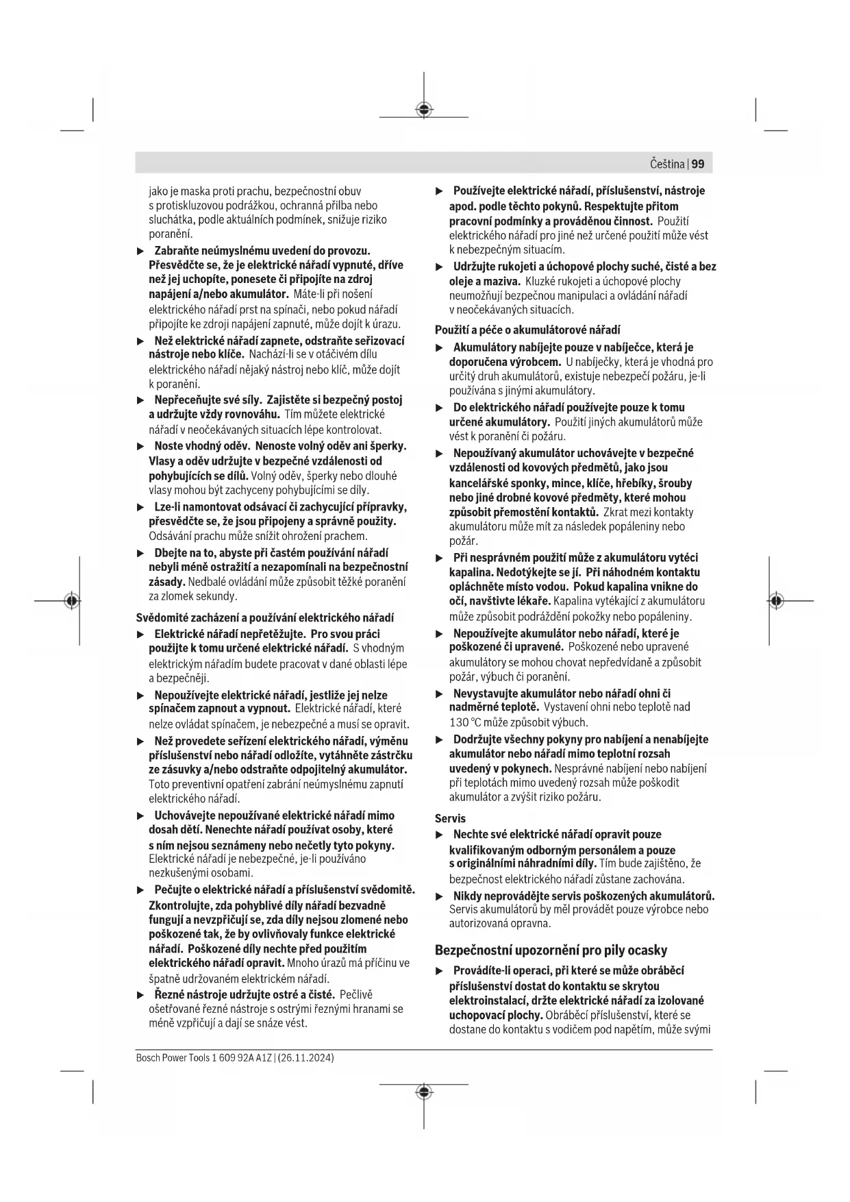 1 609 92A A1Z | (26.11.2024) Bosch Power ToolsČeština | 101 Pila ocaska GSA185‑LI Doporučená teplota prostředí při nabíjení °C 0až+35 Dovolená teplota prostředí při provozu