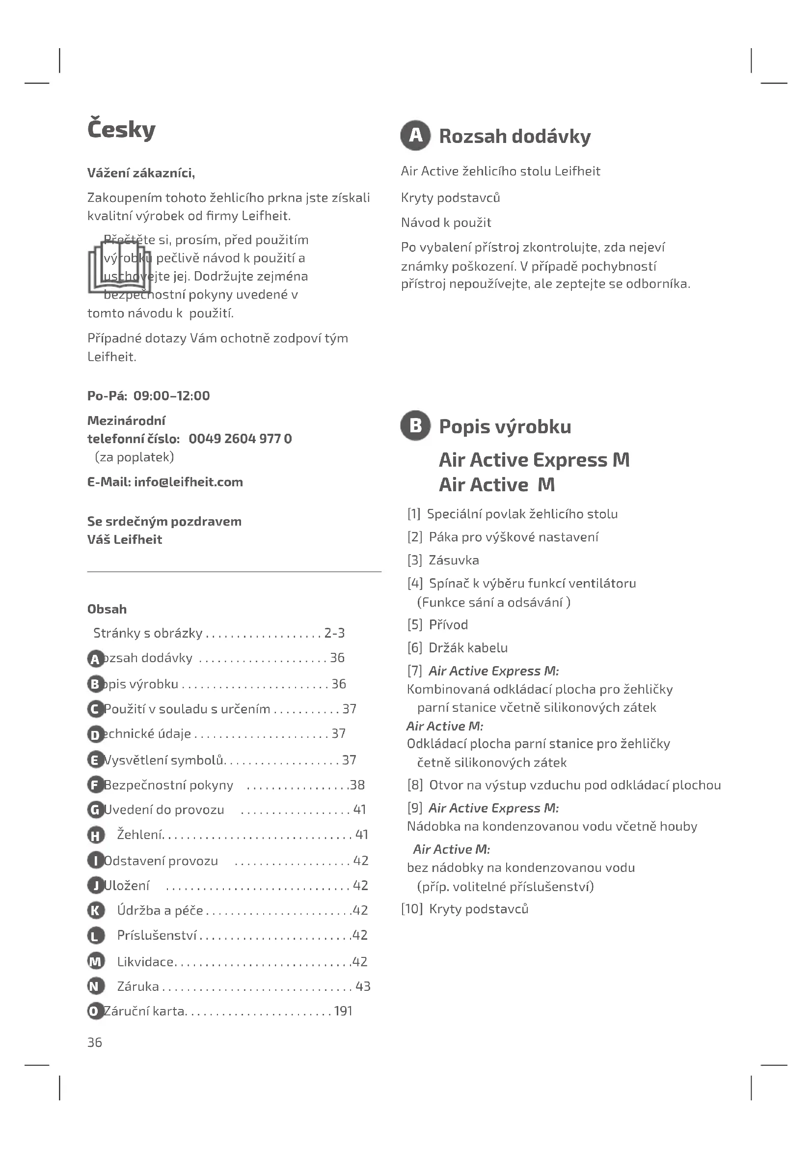 - Záručníkarta AirActivežehlicíhostoluLeifheit Krytypodstavců Návodkpoužit Povybalenípřístrojzkontrolujte,zdanejeví známkypoškození.Vpřípaděpochybností přístrojnepoužívejte,alezeptejteseodborníka. p. 191