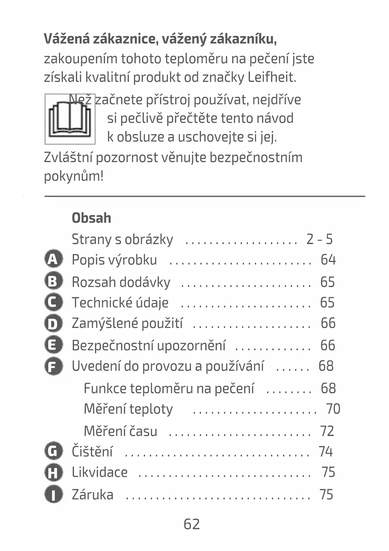 Verwijdering Garantie OpdebraadthermometerbiedtLeifheitAG u 2 jaar garantie gerekend vanaf de aankoopda- tum (resp. bij bestellingen vanaf ontvangst van het product). Meerinformatieoverdegarantieregelingvindt u op onze website: www.leifheit.com62 Vážená zákaznice, vážený zákazníku, zakoupenímtohototeploměrunapečeníjste získalikvalitníproduktodznačkyLeifheit. Nežzačnetepřístrojpoužívat,nejdříve sipečlivěpřečtětetentonávod k obsluze a uschovejte si jej. Zvláštnípozornostvěnujtebezpečnostním pokynům!