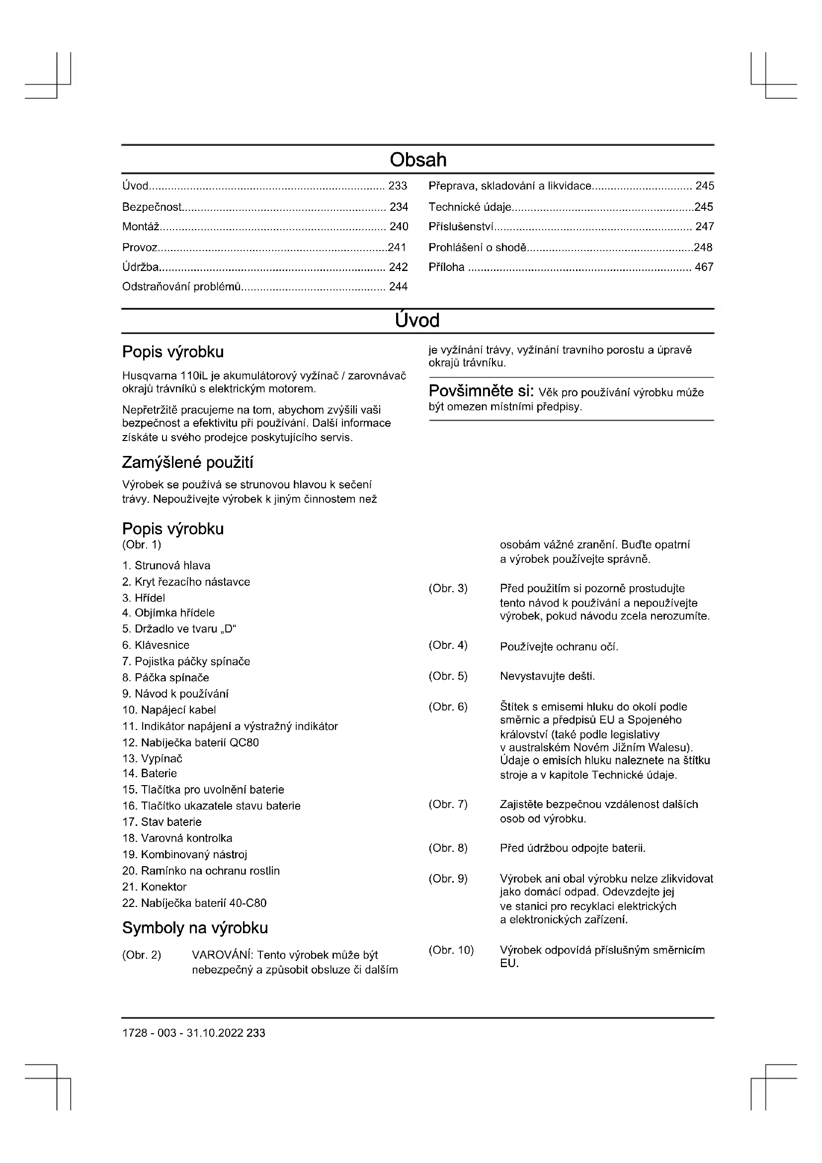 - Huskvarna, 2022-07-05 Claes Losdal, izpētes un attīstības nodaļas vadītājs, HusqvarnaAB Atbildīgais par tehnisko dokumentāciju 232 1728 - 003 - 31.10.2022Obsah Úvod p. 233