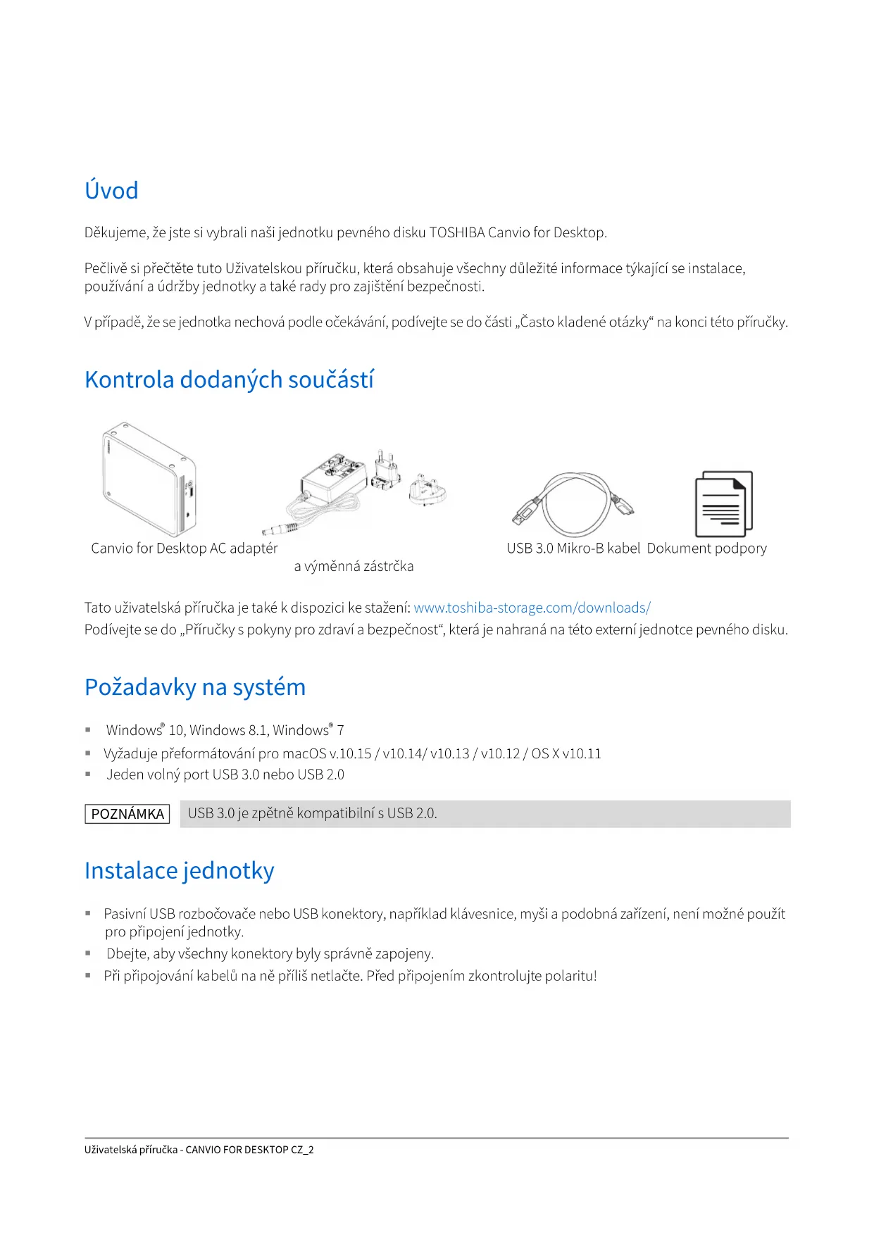 - Regulační opatření Uživatelská příručka - CANVIO FOR DESKTOP CZ_2 Úvod Děkujeme, že jste si vybrali naši jednotku pevného disku TOSHIBA Canvio for Desktop. Pečlivě si přečtěte tuto Uživatelskou příručku, která obsahuje všechny důležité informace týkající se instalace, používání a údržby jednotky a také rady pro zajištění bezpečnosti. V případě, že se jednotka nechová podle očekávání, podívejte se do části „Často kladené otázky“ na konci této příručky. Kontrola dodaných součástí Tato uživatelská příručka je také k dispozici ke stažení: www.toshiba-storage.com/downloads/ Podívejte se do „Příručky s pokyny pro zdraví a bezpečnost“, která je nahraná na této externí jednotce pevného disku. Požadavky na systém Windows p. 7