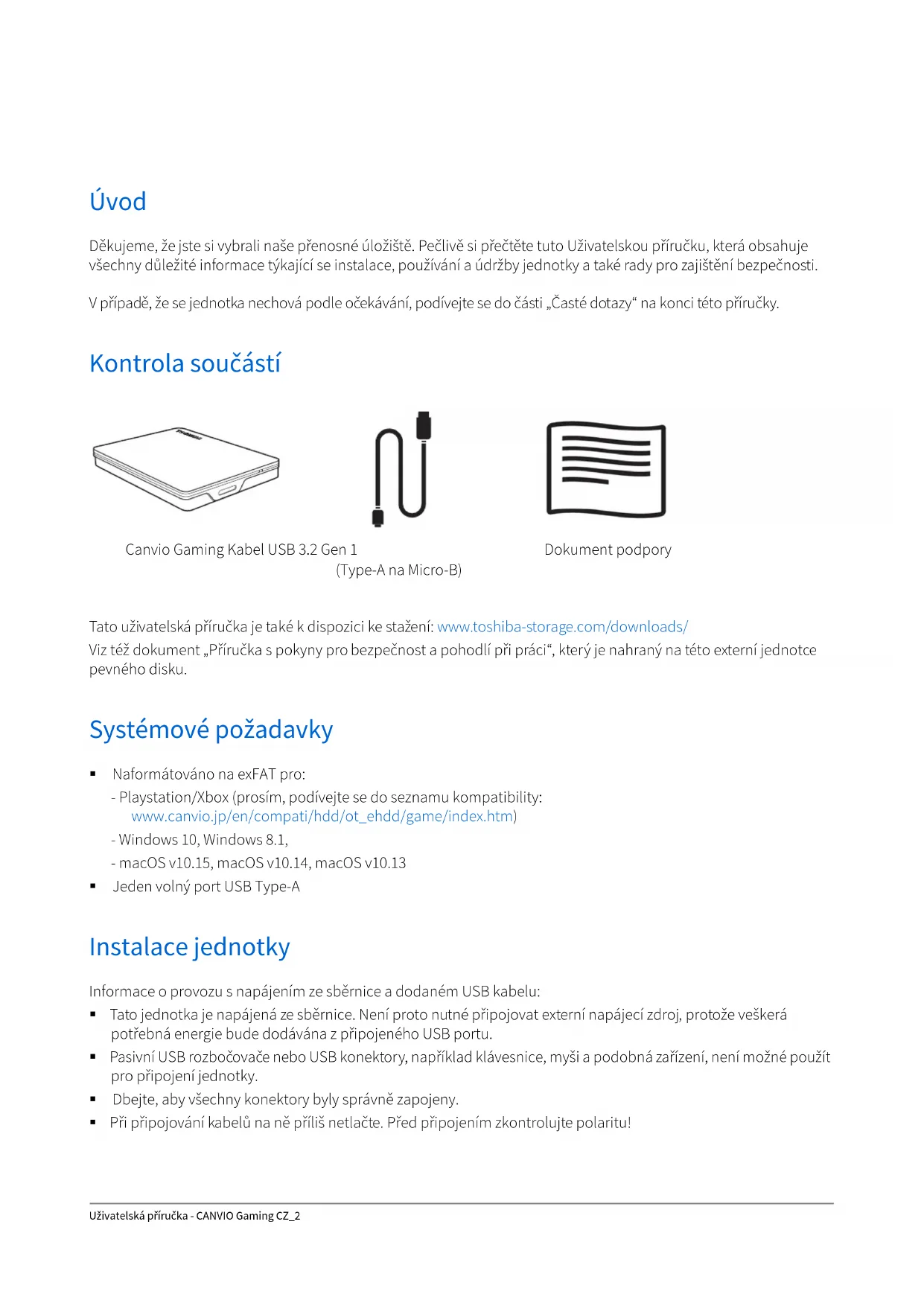 - Regulační opatření Uživatelská příručka - CANVIO Gaming CZ_2 Úvod Děkujeme, že jste si vybrali naše přenosné úložiště. Pečlivě si přečtěte tuto Uživatelskou příručku, která obsahuje všechny důležité informace týkající se instalace, používání a údržby jednotky a také rady pro zajištění bezpečnosti. V případě, že se jednotka nechová podle očekávání, podívejte se do části „Časté dotazy“ na konci této příručky. Kontrola součástí Tato uživatelská příručka je také k dispozici ke stažení: www.toshiba-storage.com/downloads/ Viz též dokument „Příručka s pokyny pro bezpečnost a pohodlí při práci“, který je nahraný na této externí jednotce pevného disku. Systémové požadavky Naformátováno na exFAT pro: - Playstation/Xbox (prosím, podívejte se do seznamu kompatibility: www.canvio.jp/en/compati/hdd/ot_ehdd/game/index.htm) - Windows 10, Windows 8.1, - macOS v10.15, macOS v10.14, macOS v10.13 Jeden volný port USB Type-A Instalace jednotky Informace o provozu s napájením ze sběrnice a dodaném USB kabelu: Tato jednotka je napájená ze sběrnice. Není proto nutné připojovat externí napájecí zdroj, protože veškerá potřebná energie bude dodávána z připojeného USB portu. Pasivní USB rozbočovače nebo USB konektory, například klávesnice, myši a podobná zařízení, není možné použít pro připojení jednotky. Dbejte, aby všechny konektory byly správně zapojeny. Při připojování kabelů na ně příliš netlačte. Před připojením zkontrolujte polaritu! Canvio Gaming Kabel USB 3.2 Gen 1 (Type-A na Micro-B) Dokument podporyUživatelská příručka - CANVIO Gaming CZ_3 Připojení jednotky ke kompatibilnímu zařízení Zkontrolujte kompatibilitu zařízení a podívejte se na pokyny pro připojení v příslušných uživatelských příručkách zařízení. p. 6