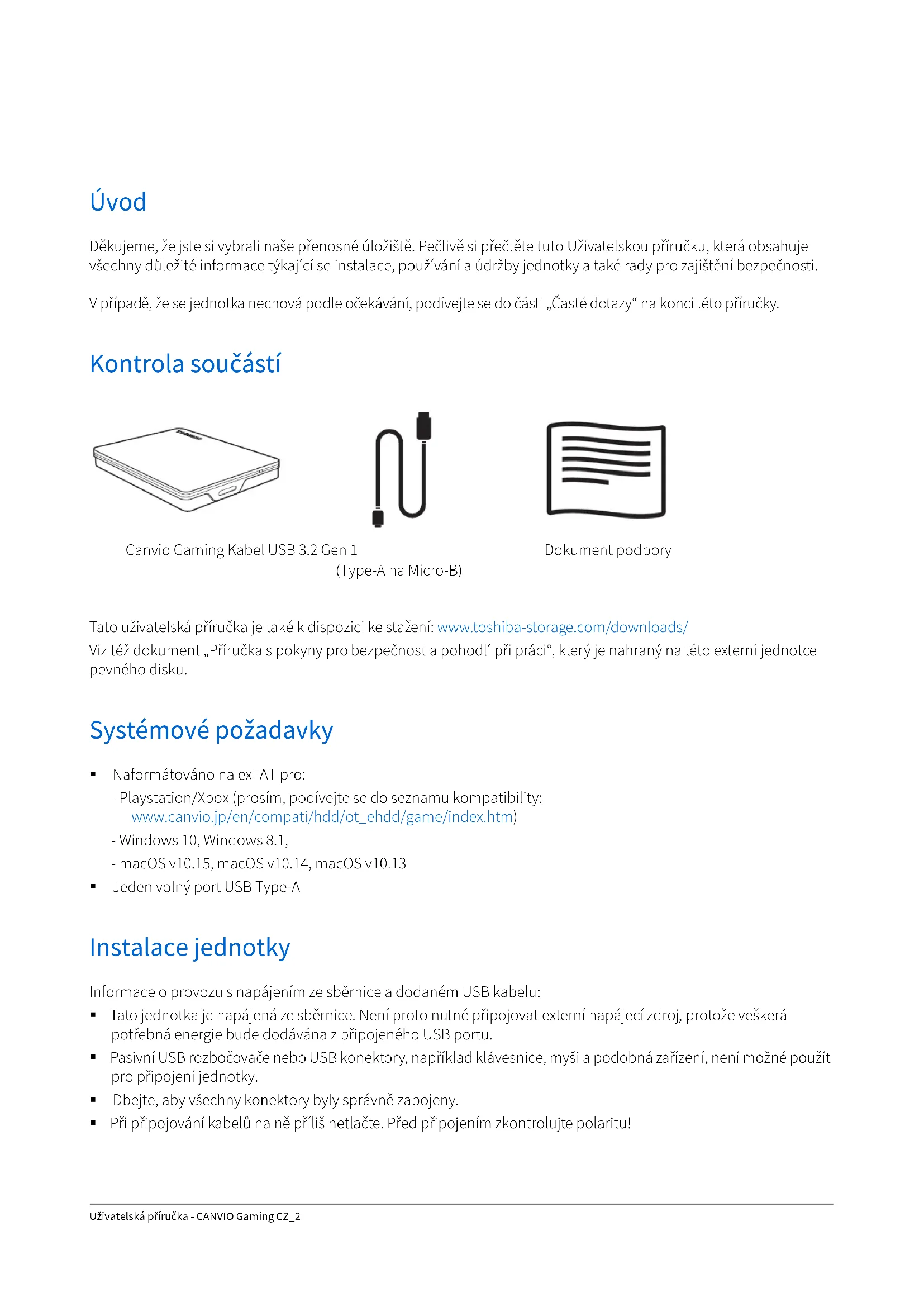 - Regulační opatření Uživatelská příručka - CANVIO Gaming CZ_2 Úvod Děkujeme, že jste si vybrali naše přenosné úložiště. Pečlivě si přečtěte tuto Uživatelskou příručku, která obsahuje všechny důležité informace týkající se instalace, používání a údržby jednotky a také rady pro zajištění bezpečnosti. V případě, že se jednotka nechová podle očekávání, podívejte se do části „Časté dotazy“ na konci této příručky. Kontrola součástí Tato uživatelská příručka je také k dispozici ke stažení: www.toshiba-storage.com/downloads/ Viz též dokument „Příručka s pokyny pro bezpečnost a pohodlí při práci“, který je nahraný na této externí jednotce pevného disku. Systémové požadavky Naformátováno na exFAT pro: - Playstation/Xbox (prosím, podívejte se do seznamu kompatibility: www.canvio.jp/en/compati/hdd/ot_ehdd/game/index.htm) - Windows 10, Windows 8.1, - macOS v10.15, macOS v10.14, macOS v10.13 Jeden volný port USB Type-A Instalace jednotky Informace o provozu s napájením ze sběrnice a dodaném USB kabelu: Tato jednotka je napájená ze sběrnice. Není proto nutné připojovat externí napájecí zdroj, protože veškerá potřebná energie bude dodávána z připojeného USB portu. Pasivní USB rozbočovače nebo USB konektory, například klávesnice, myši a podobná zařízení, není možné použít pro připojení jednotky. Dbejte, aby všechny konektory byly správně zapojeny. Při připojování kabelů na ně příliš netlačte. Před připojením zkontrolujte polaritu! Canvio Gaming Kabel USB 3.2 Gen 1 (Type-A na Micro-B) Dokument podporyUživatelská příručka - CANVIO Gaming CZ_3 Připojení jednotky ke kompatibilnímu zařízení Zkontrolujte kompatibilitu zařízení a podívejte se na pokyny pro připojení v příslušných uživatelských příručkách zařízení. p. 6