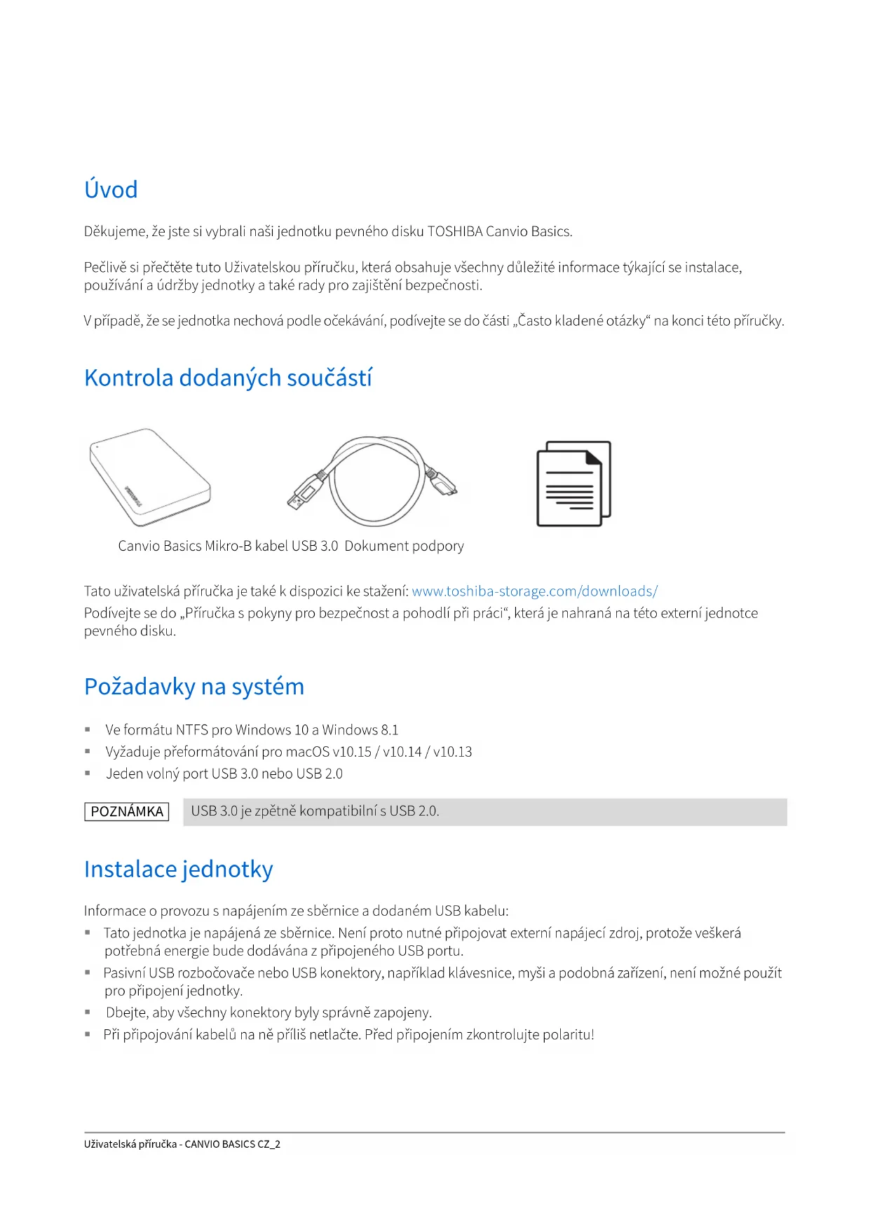 - Regulační opatření Uživatelská příručka - CANVIO BASICS CZ_2 Úvod Děkujeme, že jste si vybrali naši jednotku pevného disku TOSHIBA Canvio Basics. Pečlivě si přečtěte tuto Uživatelskou příručku, která obsahuje všechny důležité informace týkající se instalace, používání a údržby jednotky a také rady pro zajištění bezpečnosti. V případě, že se jednotka nechová podle očekávání, podívejte se do části „Často kladené otázky“ na konci této příručky. Kontrola dodaných součástí Tato uživatelská příručka je také k dispozici ke stažení: www.toshiba-storage.com/downloads/ Podívejte se do „Příručka s pokyny pro bezpečnost a pohodlí při práci“, která je nahraná na této externí jednotce pevného disku. Požadavky na systém Ve formátu NTFS pro Windows 10 a Windows 8.1 Vyžaduje přeformátování pro macOS v10.15 / v10.14 / v10.13 Jeden volný port USB 3.0 nebo USB 2.0 Instalace jednotky Informace o provozu s napájením ze sběrnice a dodaném USB kabelu: Tato jednotka je napájená ze sběrnice. Není proto nutné připojovat externí napájecí zdroj, protože veškerá potřebná energie bude dodávána z připojeného USB portu. Pasivní USB rozbočovače nebo USB konektory, například klávesnice, myši a podobná zařízení, není možné použít pro připojení jednotky. Dbejte, aby všechny konektory byly správně zapojeny. Při připojování kabelů na ně příliš netlačte. Před připojením zkontrolujte polaritu! USB 3.0 je zpětně kompatibilní s USB 2.0. Canvio Basics Mikro-B kabel USB 3.0 Dokument podpory POZNÁMKAUživatelská příručka - CANVIO BASICS CZ_3 Připojení jednotky k počítači p. 6