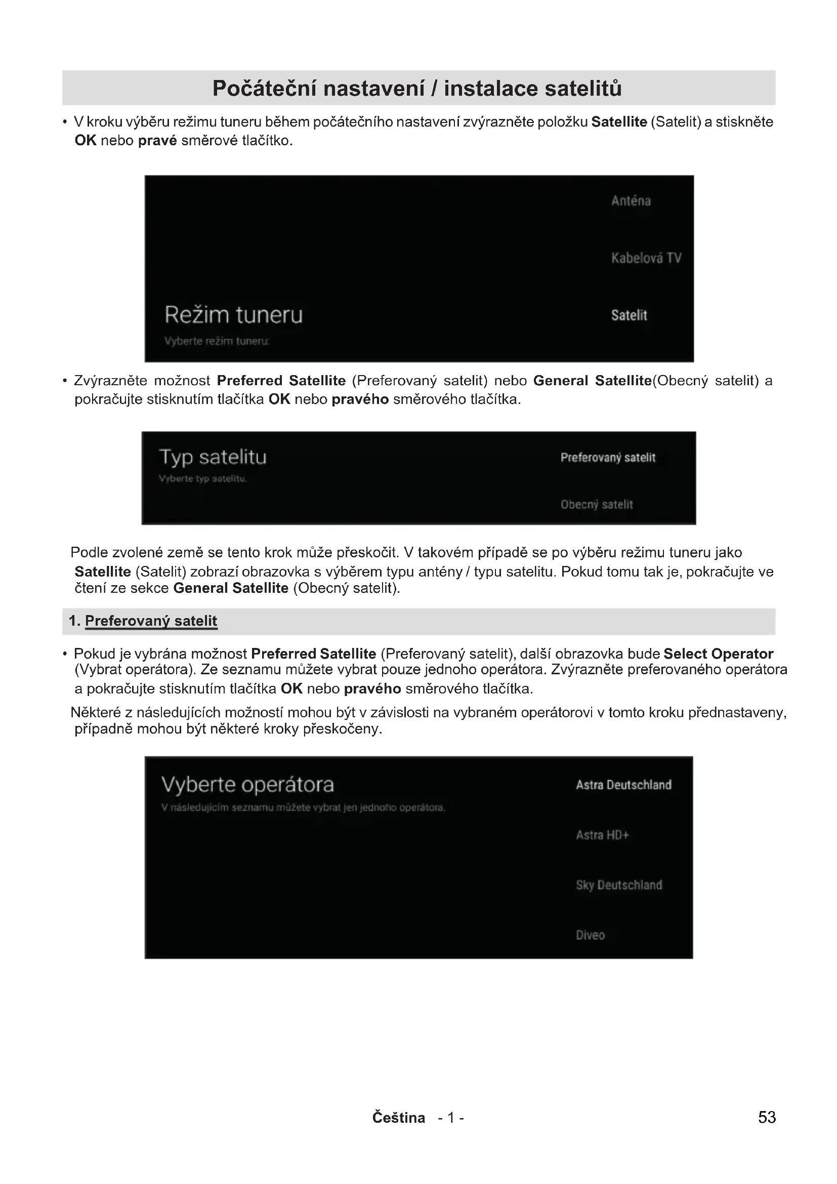 - První možnost satelitu se přednastaví v souladu se zvoleným operátorem. Pokračujte stisknutím pravého směrového tlačítka. 56Čeština - 5 -