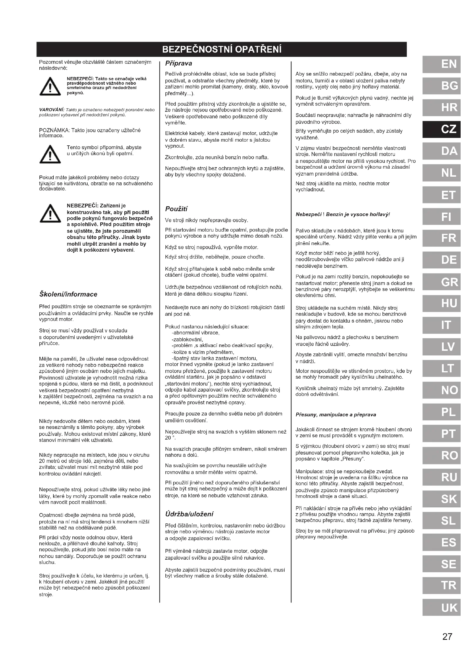 Příprava Pečlivě prohlédněte oblast, kde se bude přístroj používat, a odstraňte všechny předměty, které by zařízení mohlo promítat (kameny, dráty, sklo, kovové předměty...). Před použitím přístroj vždy zkontrolujte a ujistěte se, že nástroje nejsou opotřebované nebo poškozené. Veškeré opotřebované nebo poškozené díly vyměňte. Elektrické kabely, které zastavují motor, udržujte v dobrém stavu, abyste mohli motor s jistotou vypnout. Zkontrolujte, zda neuniká benzín nebo nafta. Nepoužívejte stroj bez ochranných krytů a zajistěte, aby byly všechny spojky dotažené. Použití Ve stroji nikdy nepřepravujte osoby. Při startování motoru buďte opatrní, postupujte podle pokynů výrobce a nohy udržujte mimo dosah nožů. Když se stroj nepoužívá, vypněte motor. Když stroj držíte, neběhejte, pouze choďte. Když stroj přitahujete k sobě nebo měníte směr otáčení (pokud chcete), buďte velmi opatrní. Udržujte bezpečnou vzdálenost od rotujících nožů, která je dána délkou sloupku řízení. Nedávejte ruce ani nohy do blízkosti rotujících částí ani pod ně. Pokud nastanou následující situace: -abnormální vibrace, -zablokování, -problém ,s aktivací nebo deaktivací spojky, -kolize s vizím předmětem, -špatný stav lanka zastavení motoru, motor ihned vypněte (pokud je lanko zastavení motoru přetržené, použijte k zastavení motoru ovládání startéru, jak je popsáno v odstavci „startování motoru“), nechte stroj vychladnout, odpojte kabel zapalovací svíčky, zkontrolujte stroj a před opětovným použitím nechte schváleného opraváře provést nezbytné opravy. Pracujte pouze za denního světla nebo při dobrém umělém osvětlení. Nepoužívejte stroj na svazích s vyšším sklonem než 20 °. Na svazích pracujte příčným směrem, nikoli směrem nahoru a dolů. Na svažujícím se povrchu neustále udržujte rovnováhu a směr měňte velmi opatrně. Při použití jiného než doporučeného příslušenství může být stroj nebezpečný a může dojít k poškození stroje, na které se nebude vztahovat záruka. Údržba/uložení Před čištěním, kontrolou, nastavením nebo údržbou stroje nebo výměnou nástrojů zastavte motor a odpojte zapalovací svíčku. Při výměně nástrojů zastavte motor, odpojte zapalovací svíčku a použijte silné rukavice. Abyste zajistili bezpečné podmínky používání, musí být všechny matice a šrouby stále dotažené. Aby se snížilo nebezpečí požáru, dbejte, aby na motoru, tlumiči a v oblasti uložení paliva nebyly rostliny, vyjetý olej nebo jiný hořlavý materiál. Pokud je tlumič výfukových plynů vadný, nechte jej vyměnit schváleným opravářem. Součásti neopravujte; nahraďte je náhradními díly původního výrobce. Břity vyměňujte po celých sadách, aby zůstaly vyvážené. V zájmu vlastní bezpečnosti neměňte vlastnosti stroje. Neměňte nastavení rychlosti motoru a nespouštějte motor na příliš vysokou rychlost. Pro bezpečnost a udržení úrovně výkonu má zásadní význam pravidelná údržba. Než stroj uklidíte na místo, nechte motor vychladnout. Nebezpečí ! Benzín je vysoce hořlavý! Palivo skladujte v nádobách, které jsou k tomu speciálně určeny. Nádrž vždy plňte venku a při jejím plnění nekuřte. Když motor běží nebo je ještě horký, neodšroubovávejte víčko palivové nádrže ani ji nedolévejte benzínem. Pokud je na zemi rozlitý benzín, nepokoušejte se nastartovat motor; přeneste stroj jinam a dokud se benzínové páry nerozptýlí, vyhýbejte se veškerému otevřenému ohni. Stroj ukládejte na suchém místě. Nikdy stroj neskladujte v budově, kde se mohou benzínové páry dostat do kontaktu s ohněm, jiskrou nebo silným zdrojem tepla. Na palivovou nádrž a plechovku s benzínem vracejte řádně uzávěry. Abyste zabránili vylití, omezte množství benzínu v nádrži. Motor nespouštějte ve stísněném prostoru, kde by se mohly hromadit páry kysličníku uhelnatého. Kysličník uhelnatý může být smrtelný. Zajistěte dobré odvětrávání. Přesuny, manipulace a přeprava Jakákoli činnost se strojem kromě hloubení otvorů v zemi se musí provádět s vypnutým motorem. S výjimkou (hloubení otvorů v zemi) se stroj musí přesunovat pomocí přepravního kolečka, jak je popsáno v kapitole „Přesuny“. Manipulace: stroj se nepokoušejte zvedat. Hmotnost stroje je uvedena na štítku výrobce na konci této příručky. Abyste zajistili bezpečnost, používejte způsob manipulace přizpůsobený hmotnosti stroje a dané situaci. Při nakládání stroje na přívěs nebo jeho vykládání z přívěsu použijte vhodnou rampu. Abyste zajistili bezpečnou přepravu, stroj řádně zajistěte řemeny. Stroj by se měl přepravovat na přívěsu; jiný způsob přepravy nepoužívejte.