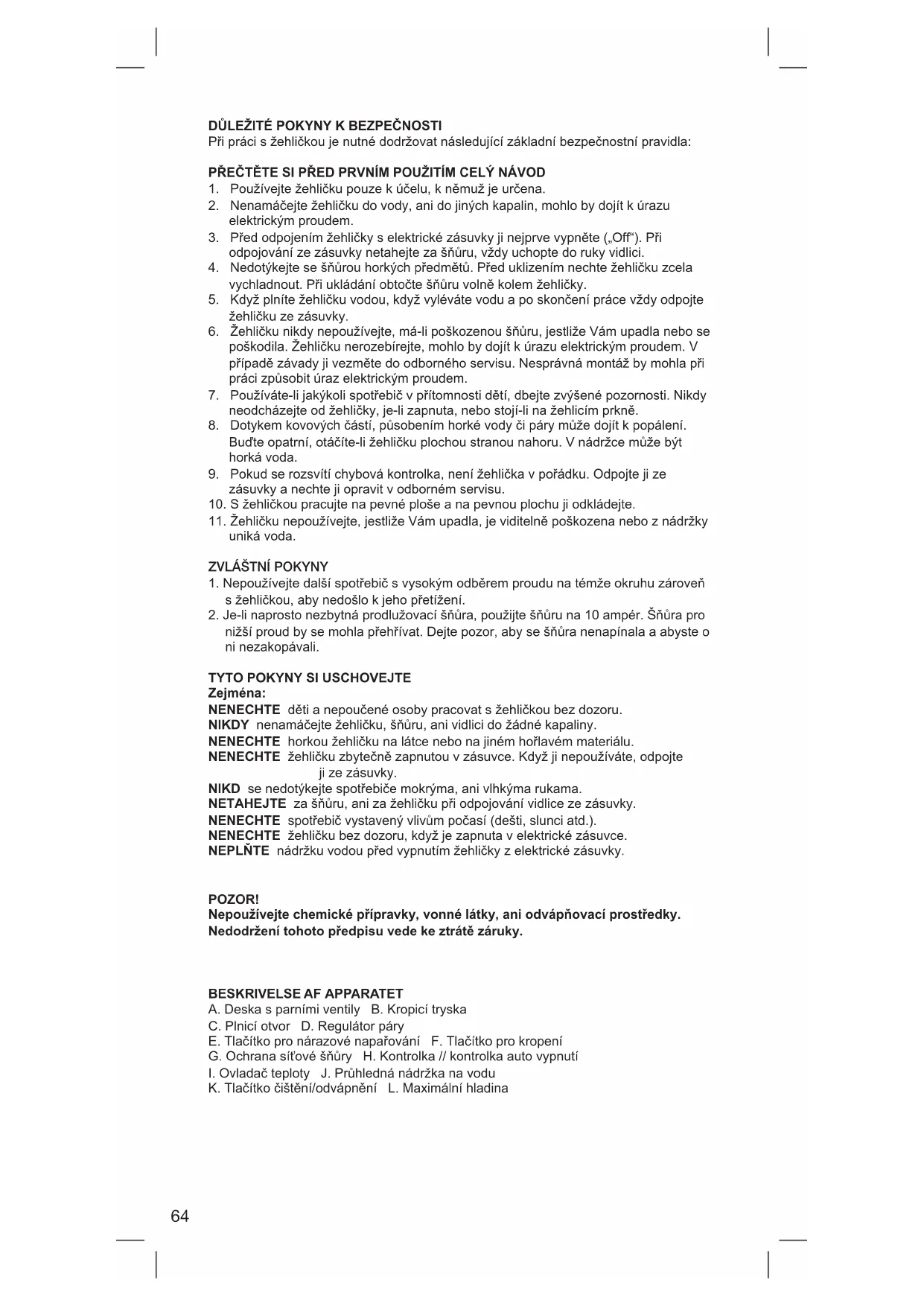 Zejména: NENECHTE děti a nepoučené osoby pracovat s žehličkou bez dozoru. NIKDY nenamáčejte žehličku, šňůru, ani vidlici do žádné kapaliny. NENECHTE horkou žehličku na látce nebo na jiném hořlavém materiálu. NENECHTE žehličku zbytečně zapnutou v zásuvce. Když ji nepoužíváte, odpojte ji ze zásuvky. NIKD se nedotýkejte spotřebiče mokrýma, ani vlhkýma rukama. NETAHEJTE za šňůru, ani za žehličku při odpojování vidlice ze zásuvky. NENECHTE spotřebič vystavený vlivům počasí (dešti, slunci atd.). NENECHTE žehličku bez dozoru, když je zapnuta v elektrické zásuvce. NEPLŇTE nádržku vodou před vypnutím žehličky z elektrické zásuvky. POZOR! Nepoužívejte chemické přípravky, vonné látky, ani odvápňovací prostředky. Nedodržení tohoto předpisu vede ke ztrátě záruky.