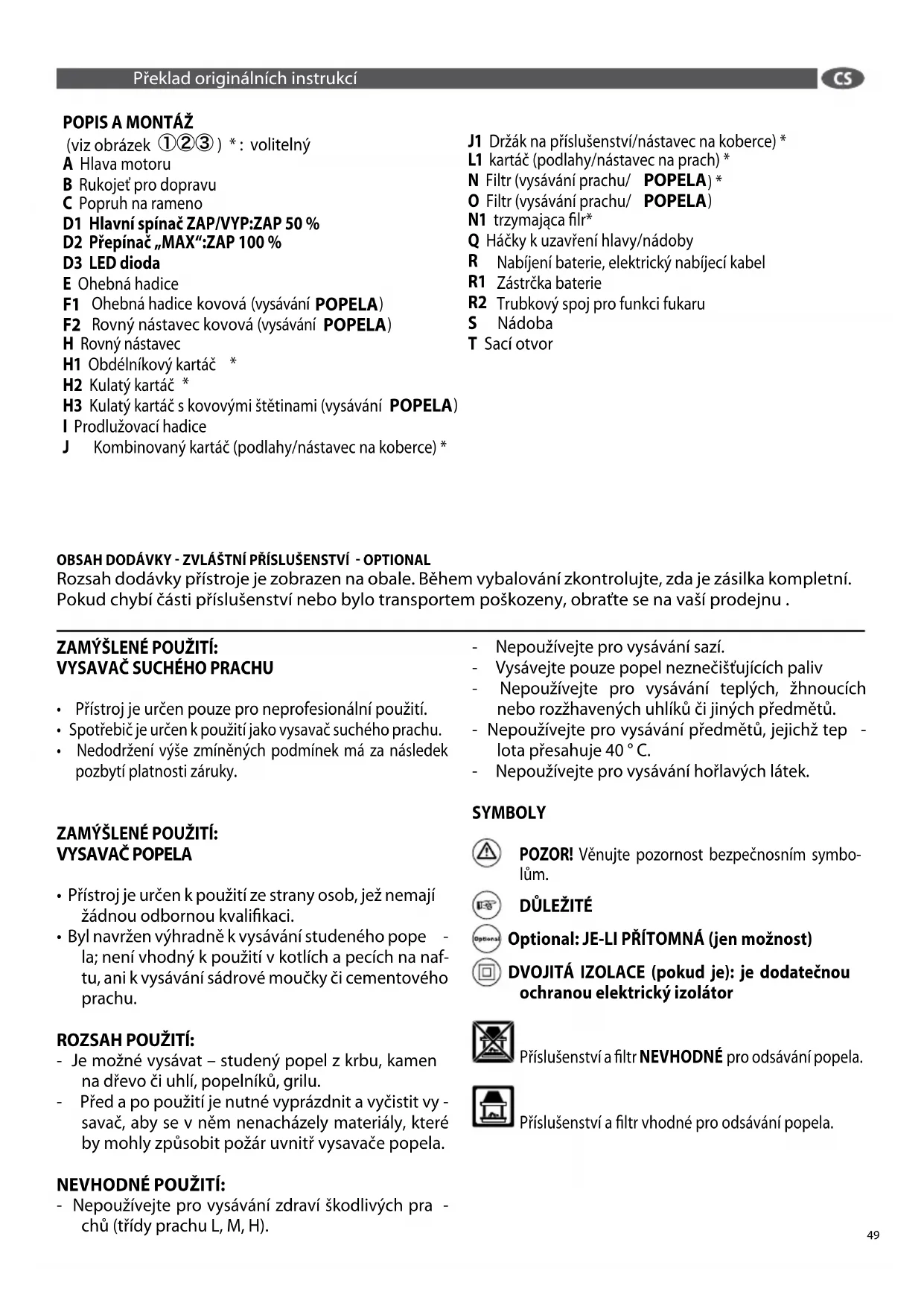 Optional: JE-LI PŘÍTOMNÁ (jen možnost) DVOJITÁ IZOLACE (pokud je): je dodatečnou ochranou elektrický izolátor Příslušenství a filtr NEVHODNÉ pro odsávání popela. Příslušenství a filtr vhodné pro odsávání popela. Překlad originálních instrukcí OBSAH DODÁVKY ZVLÁŠTNÍ PŘÍSLUŠENSTVÍ OPTIONAL Rozsah dodávky přístroje je zobrazen na obale. Během vybalování zkontrolujte, zda je zásilka kompletní. Pokud chybí části příslušenství nebo bylo transportem poškozeny, obraťte se na vaší prodejnu .