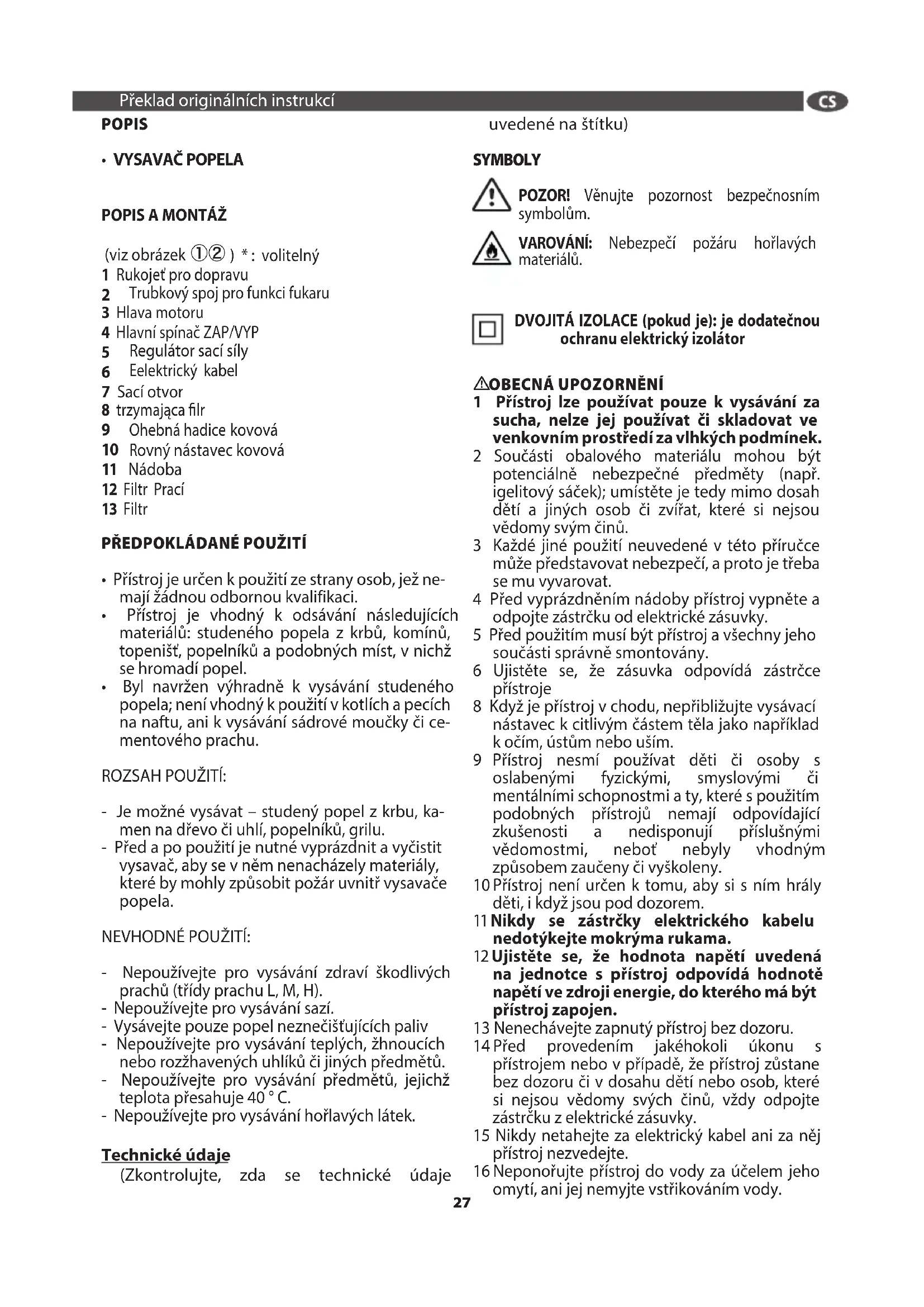 - Byl navržen výhradně k vysávání studeného popela; není vhodný k použití v kotlích a pecích na naftu, ani k vysávání sádrové moučky či ce- mentového prachu. ROZSAH POUŽITÍ: - Je možné vysávat – studený popel z krbu, ka- men na dřevo či uhlí, popelníků, grilu. - Před a po použití je nutné vyprázdnit a vyčistit vysavač, aby se v něm nenacházely materiály, které by mohly způsobit požár uvnitř vysavače popela. NEVHODNÉ POUŽITÍ: - Nepoužívejte pro vysávání zdraví škodlivých prachů (třídy prachu L, M, H). - Nepoužívejte pro vysávání sazí. - Vysávejte pouze popel neznečišťujících paliv - Nepoužívejte pro vysávání teplých, žhnoucích nebo rozžhavených uhlíků či jiných předmětů. - Nepoužívejte pro vysávání předmětů, jejichž teplota přesahuje 40 ° C. - Nepoužívejte pro vysávání hořlavých látek. Technické údaje (Zkontrolujte, zda se technické údaje Překlad originálních instrukcí uvedené na štítku) SYMBOLY