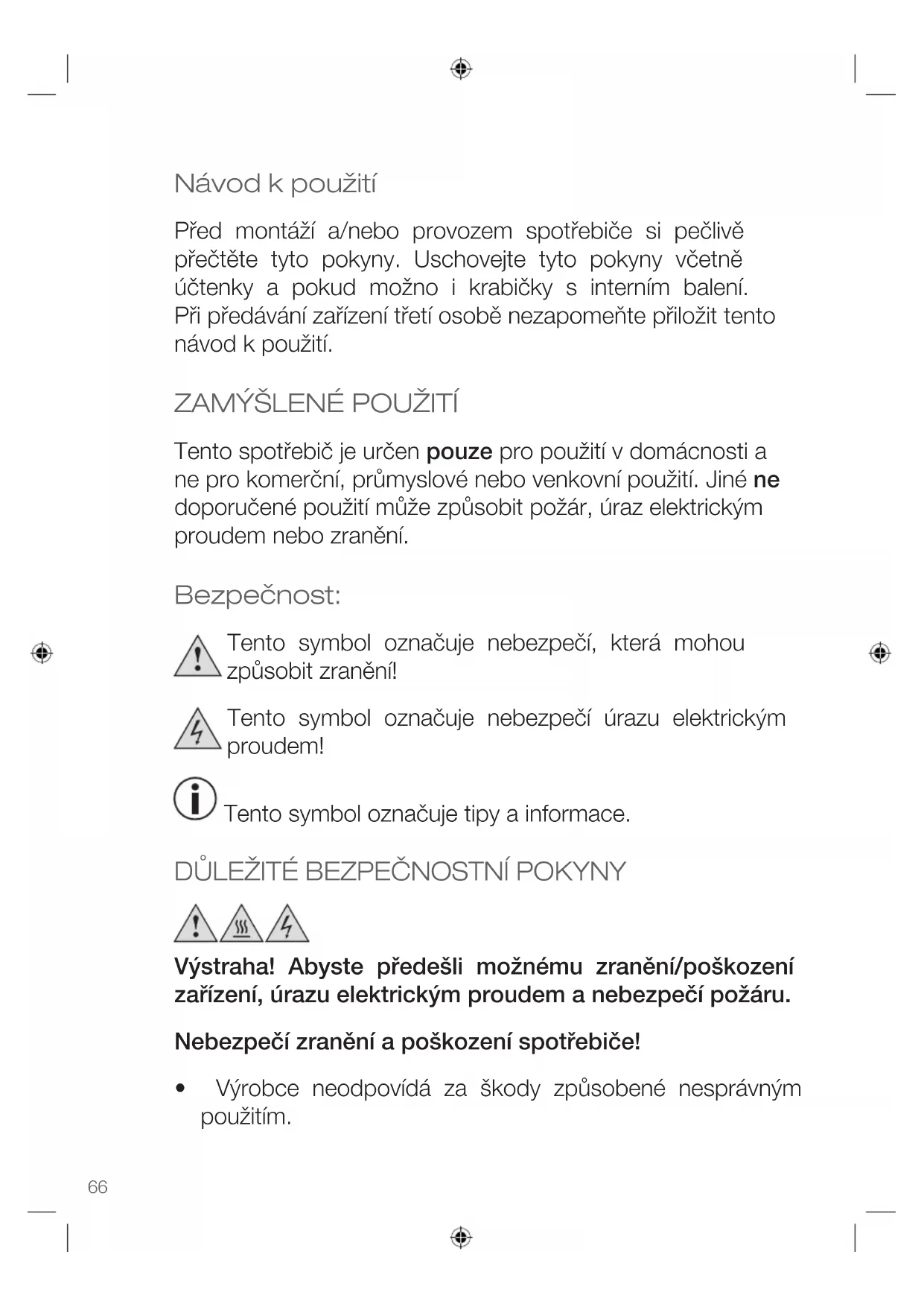 Tento spotřebič je určen pouze pro použití v domácnosti a ne pro komerční, průmyslové nebo venkovní použití. Jiné ne doporučené použití může způsobit požár, úraz elektrickým proudem nebo zranění. Bezpečnost: Tento symbol označuje nebezpečí, která mohou způsobit zranění! Tento symbol označuje nebezpečí úrazu elektrickým proudem! Tento symbol označuje tipy a informace.