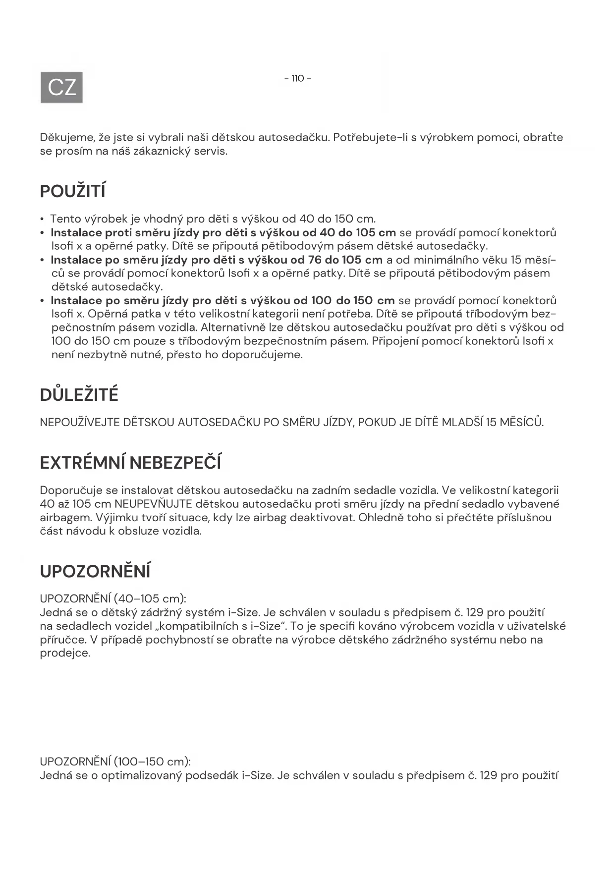 Doporučuje se instalovat dětskou autosedačku na zadním sedadle vozidla. Ve velikostní kategorii 40 až 105cm NEUPEVŇUJTE dětskou autosedačku proti směru jízdy na přední sedadlo vybavené airbagem. Výjimku tvoří situace, kdy lze airbag deaktivovat. Ohledně toho si přečtěte příslušnou část návodu k obsluze vozidla. UPOZORNĚNÍ UPOZORNĚNÍ (40–105cm): Jedná se o dětský zádržný systém i-Size. Je schválen v souladu s předpisem č.129 pro použití na sedadlech vozidel „kompatibilních s i-Size“. To je specifi kováno výrobcem vozidla v uživatelské příručce. V případě pochybností se obraťte na výrobce dětského zádržného systému nebo na prodejce. UPOZORNĚNÍ (100–150cm): Jedná se o optimalizovaný podsedák i-Size. Je schválen v souladu s předpisem č. 129 pro použití- 111 -