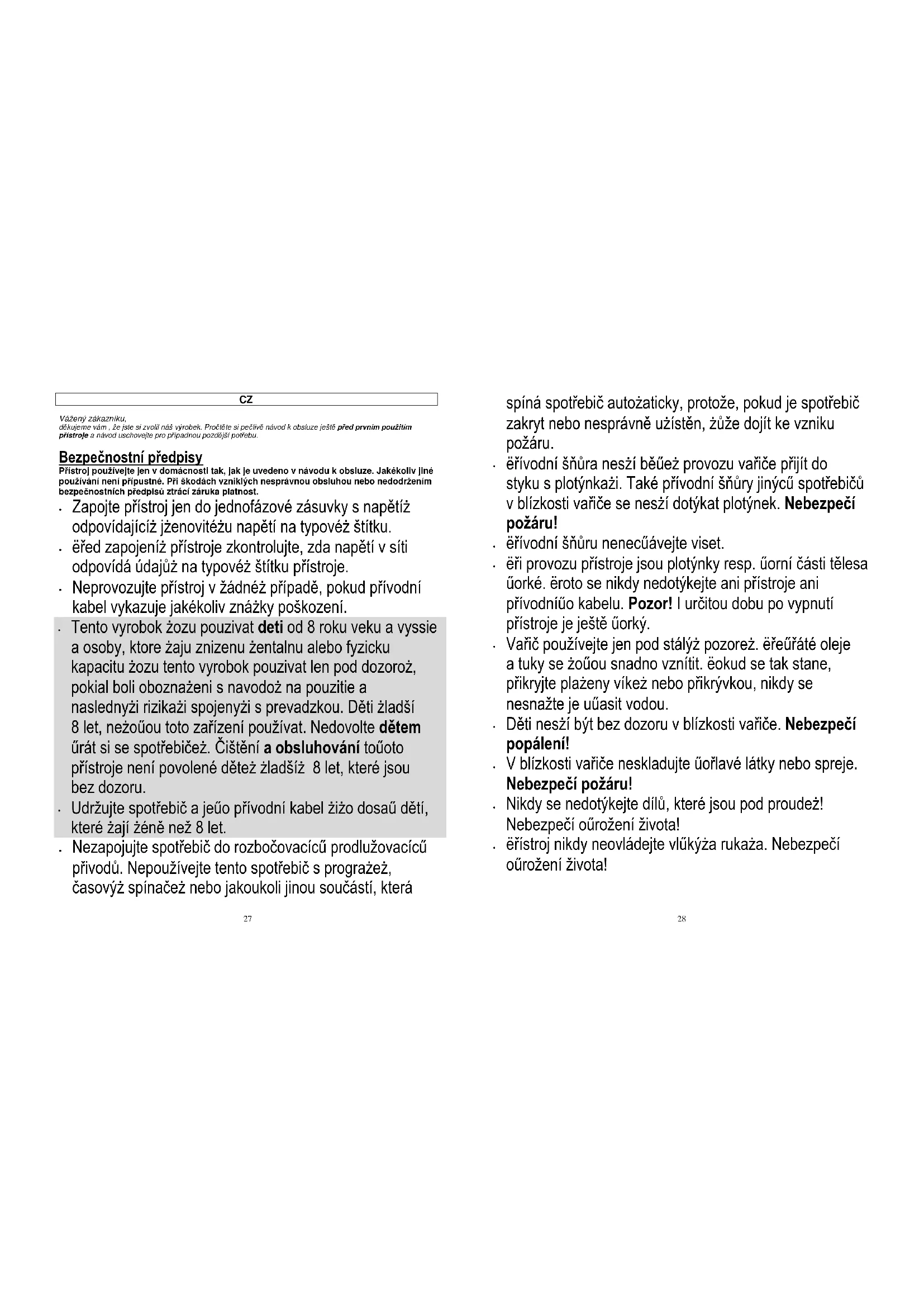 Tento vyrobok mozu pouzivat deti od 8 roku veku a vyssie a osoby, ktore maju znizenu mentalnu alebo fyzicku kapacitu mozu tento vyrobok pouzivat len pod dozorom, pokial boli oboznameni s navodom na pouzitie a naslednymi rizikami spojenymi s prevadzkou. Děti mladší 8 let, nemohou toto zařízení používat. Nedovolte dětem hrát si se spotřebičem. Čištění a obsluhování tohoto přístroje není povolené dětem mladším 8 let, které jsou bez dozoru.