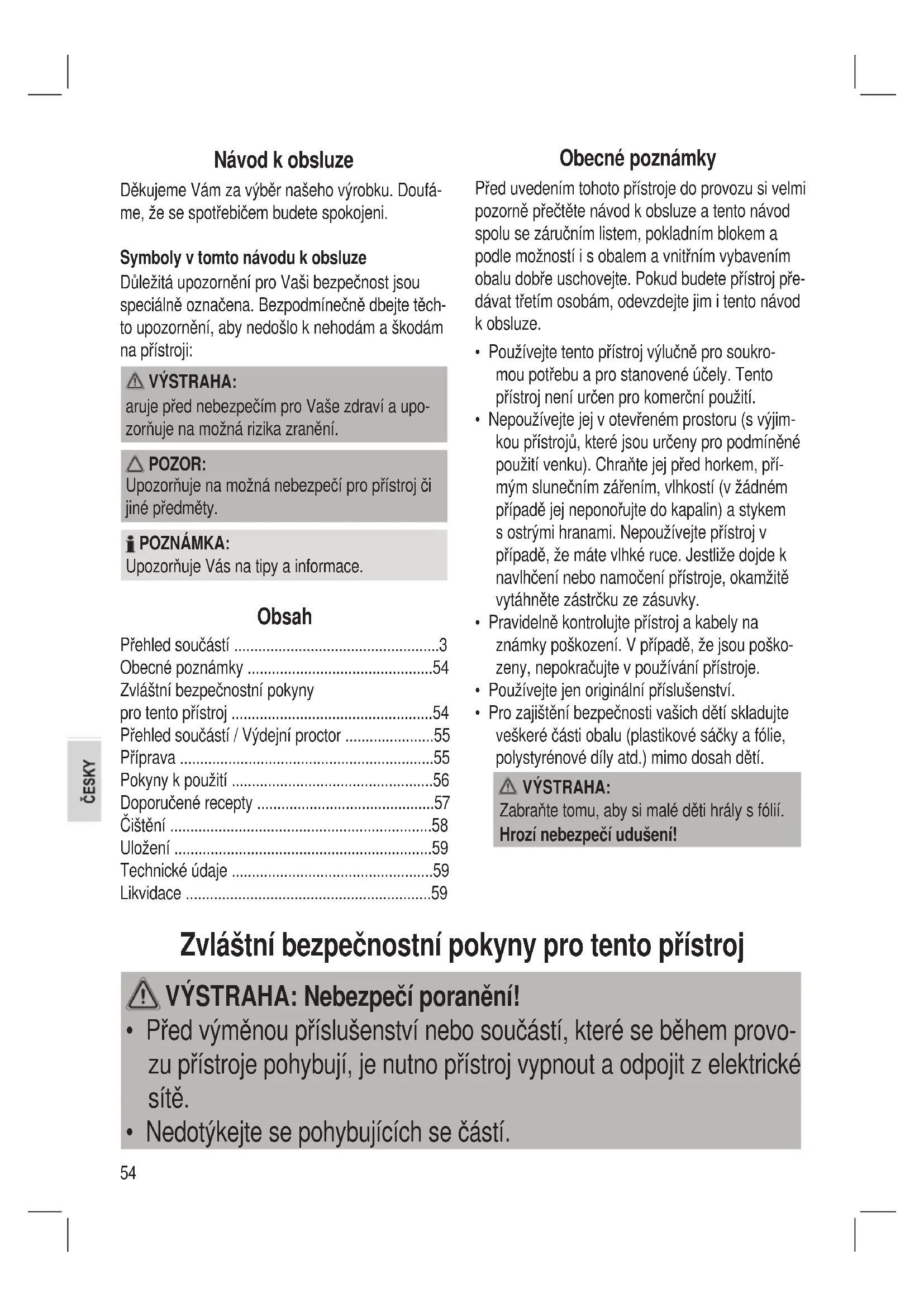 - Usuwanie Znaczenie symbolu „Pojemnik na śmieci“ Należy zadbać o środowisko i nie wy- rzucać urządzeń elektrycznych razem z odpadami gospodarstwa domowego. Stare lub uszkodzone urządzenia elektryczne należy odstawić do miejskich punktów zbiórki. Prosimy unikać potencjalnych zagrożeń dla zdro- wia i środowiska poprzez nieprawidłowe metody utylizacji odpadów. Przyczyniasz się do recyklingu i innych form uty- lizacji zużytych urządzeń elektrycznych i elektro- nicznych. Informacje na temat punktów zbiórki znajdują się na terenie danego miasta.54 Návod k obsluze Děkujeme Vám za výběr našeho výrobku. Doufá- me, že se spotřebičem budete spokojeni. Symboly v tomto návodu k obsluze Důležitá upozornění pro Vaši bezpečnost jsou speciálně označena. Bezpodmínečně dbejte těch- to upozornění, aby nedošlo k nehodám a škodám na přístroji: VÝSTRAHA: aruje před nebezpečím pro Vaše zdraví a upo- zorňuje na možná rizika zranění. POZOR: Upozorňuje na možná nebezpečí pro přístroj či jiné předměty. POZNÁMKA: Upozorňuje Vás na tipy a informace. Obsah Přehled součástí p. 3