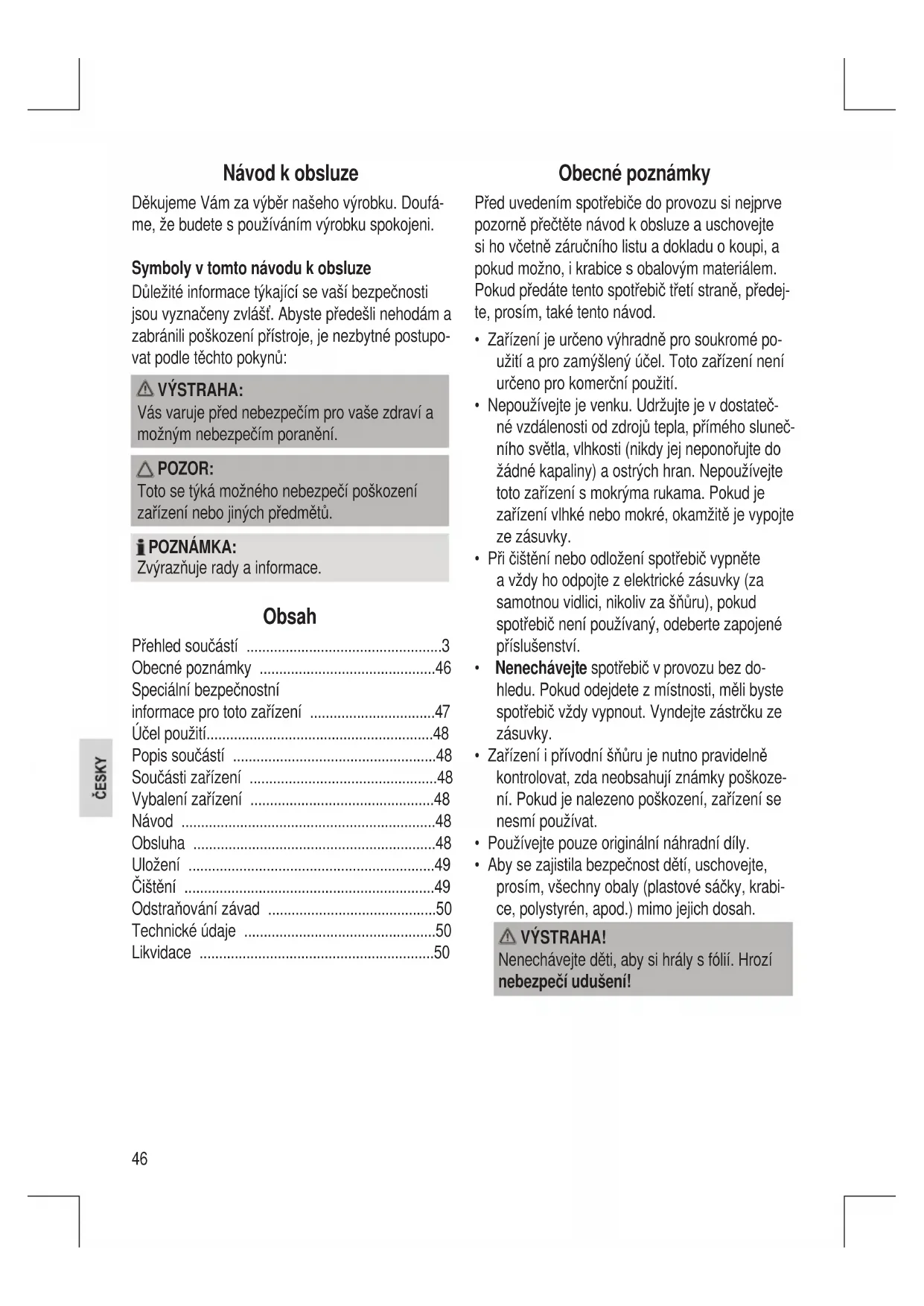 - Nezkousejte opravovat spotbrebič sami. Vždy se obratte na oprav-něho technika. Abyste se nevystavili nebezpeci, vždy si nechte poskozenou šnūru vyměnit pouze vyrobcem, našim zákaznickým servisem nebo kvalifikovanou osobou, a to za šnūru stejného typu.