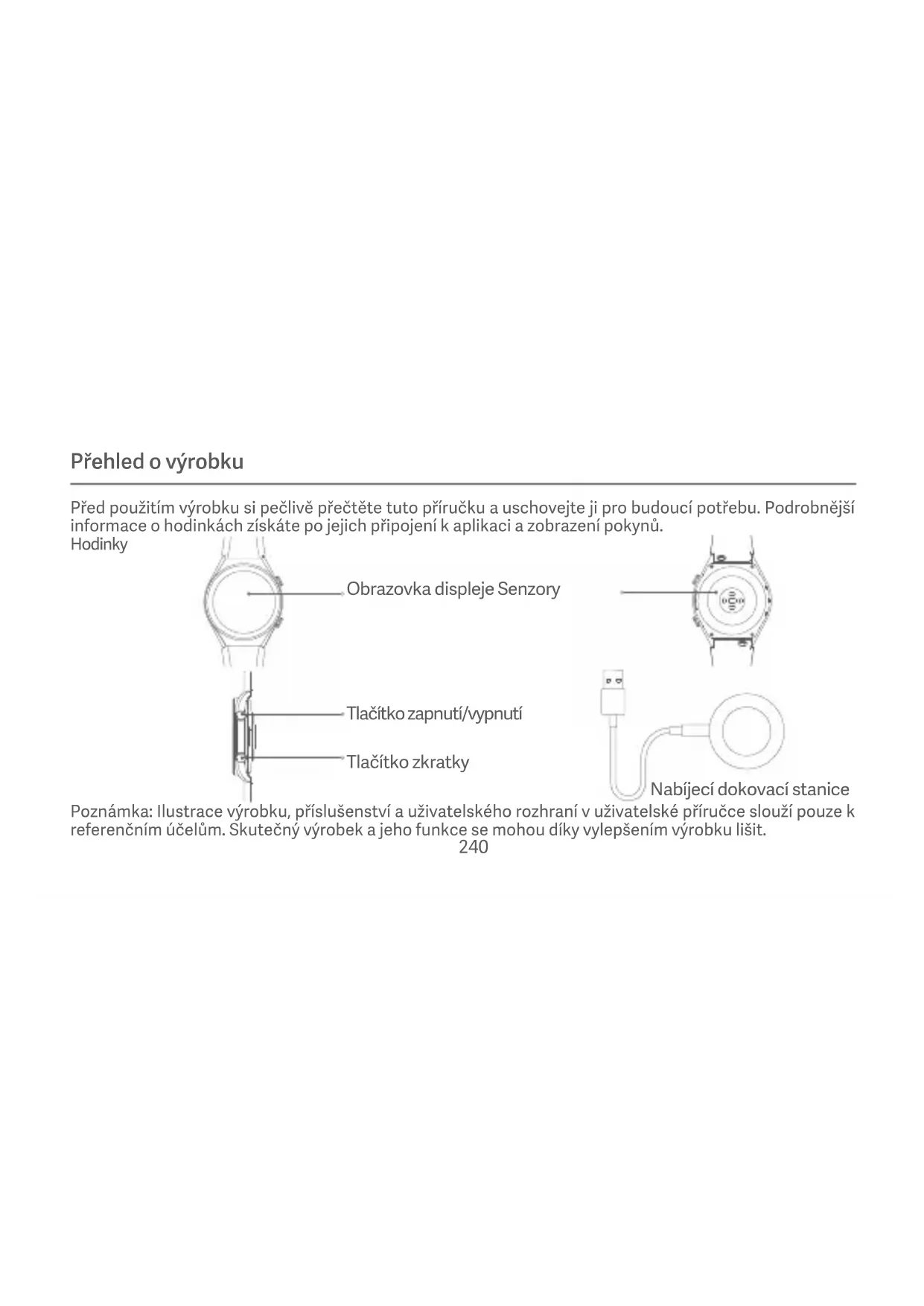 Pro denní nošení pohodlně stáhněte pásek hodinek okolo zápěstí přibližně na vzdálenost jednoho prstu od zápěstní kosti. Pásek upravte tak, aby snímač tepové frekvence mohl normálně shromažďovat data. Pokud hodinky používáte kměření tepové frekvence, držte zápěstí vklidu. Hodinky mají úroveň vodotěsnosti 5ATM (hloubka 50 metrů) Je možné je nosit do bazénu, při plavání upobřeží nebo při jiných aktivitách v mělké vodě. Nelze je však používat v horké sprše,sauně ani při přístrojovém potápění. Mějte také na paměti, že při vodních sportech nesmí být hodinky přímo zasaženy prudkým proudem vody. Vodotěsnost není trvalá a může se časem zhoršit. Dotyková obrazovka hodinek není určena k používání pod vodou. Pokud hodinky přijdou do kontaktu s vodou, před dalším používáním otřete z povrchu vodu pomocí měkké utěrky. Při běžném nošení řemínek příliš neutahujte. Udržujte kontaktní plochu suchou a pásek pravidelně čistěte vodou. Pokud se na pokožce v místě kontaktu objeví zarudnutí nebo otok, okamžitě přestaňte hodinky používat a vyhledejte lékařskou pomoc. Informace o produktu jsou pro vaši potřebu uvedeny na zadním krytu hodinek. K nabíjení hodinek používejte přiloženou nabíjecí dokovací stanici. Používejte pouze napájecí adaptéry, které vyhovují místním bezpečnostním předpisům nebo jsou certifikovány a dodávány kvalifikovaným výrobcem. Během nabíjení uchovávejte napájecí adaptér, nabíjecí dokovací stanici a hodinky v suchém prostředí. Nedotýkejte se napájecího adaptéru ani nabíjecí dokovací stanice mokrýma rukama. Nevystavujte napájecí adaptér, nabíjecí dokovací stanici ani hodinky dešti nebo jiným tekutinám.
