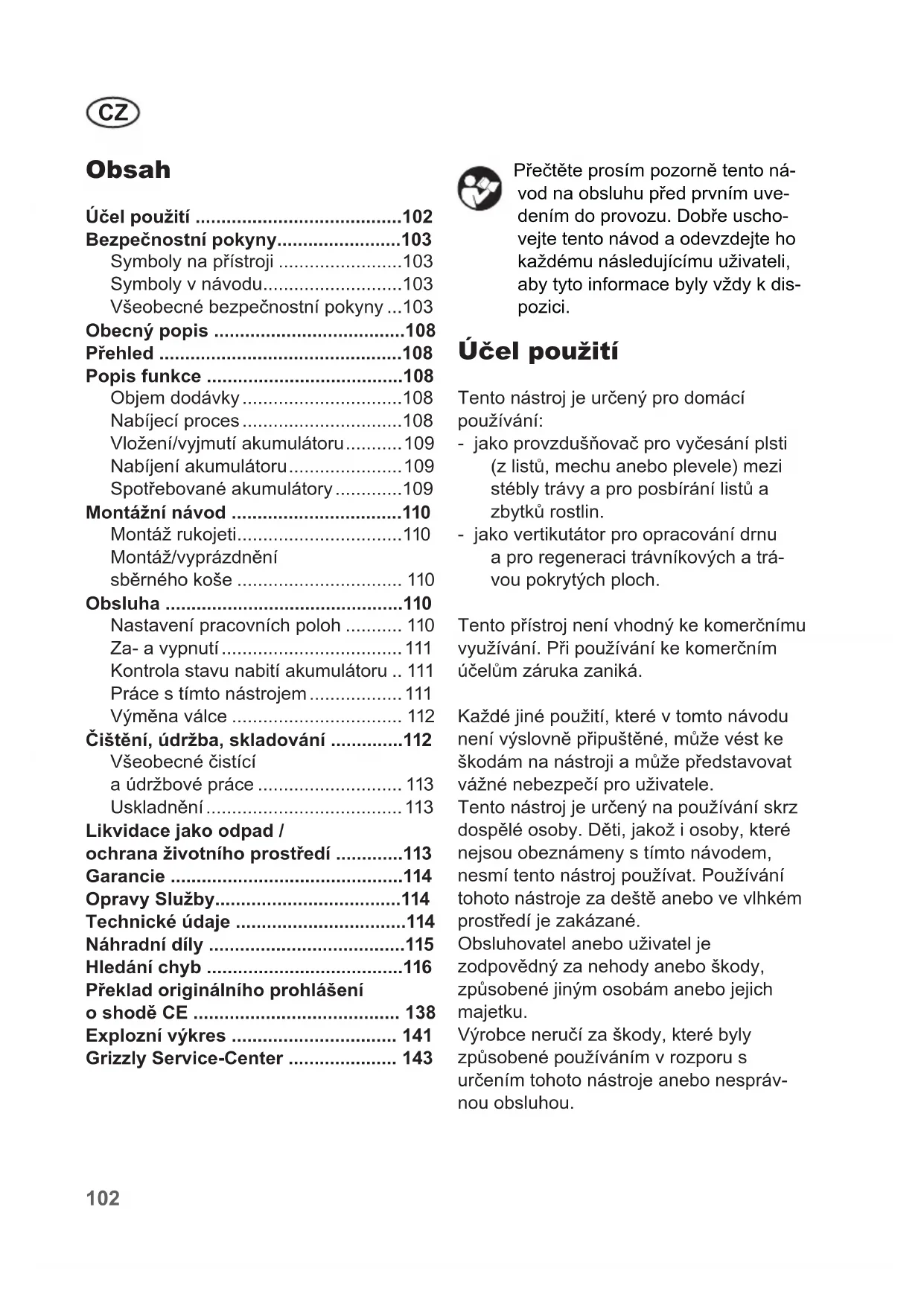 - Účinná doba provozu plně nabité baterie pod zátěží závisí na způsobu práce a zatížení Akustické hodnoty a hodnoty vibrace byly určeny dle norem a předpisů, jmenovaných v prohlášení o konformitě. Technické a optické změny mohou být v rámci dalšího vývoje provedeny bez oznámení. Všechny míry, pokyny a údaje tohoto návodu k ob- sluze nejsou proto zaručeny. Právní náro- ky, které budou kladeny na základě tohoto návodu k obsluze, nelze proto uplatnit. Uvedená emisní hodnota vibrací byla změřena podle normovaného zkušebního postupu a může být použita k porovnání elektrického přístroje s jinými přístroji. Uvedená emisní hodnota vibrací může být také použita k úvodnímu odhadu vysta- vení emisím. Výstraha: Emisní hodnota vibrací se může během skutečného používání elektrického přístroje odlišovat od uvedené hodnoty, v závislosti na způsobu, kterým je elektrický přístroj používán. Je zde nutné, aby byla stanovena bezpečnostní opatření k ochraně uživatele, která by se opírala o odhad vystavení emisím během skutečných provozních podmí- nek (přitom musí být zohledněny všechny části provozního cyklu, např. doby, kdy je elektrický přístroj vypnut, a takové, ve kterých je přístroj sice zapnut, ale běží bez zatížení). Náhradní díly Náhradní díly a příslušenství obdržíte na stránkách www.grizzly-service.eu. Pokud nemáte internet, tak prosím zavolejte na servisní středisko (viz „ Grizzly Service- Center “). Ujistěte se, že budete mít po ruce níže uvedená čísla objednávky. Akumulátor 40 V; 2.5 Ah ....................................................................................80001176 Nabíječka.......................................................................................................... 80001096 Rychlonabíječka ......................... .................................................................... 80001097 Sběrný koš........................................................................................................ 91097028 Provzdušňovací válec....................................................................................... 91097020116