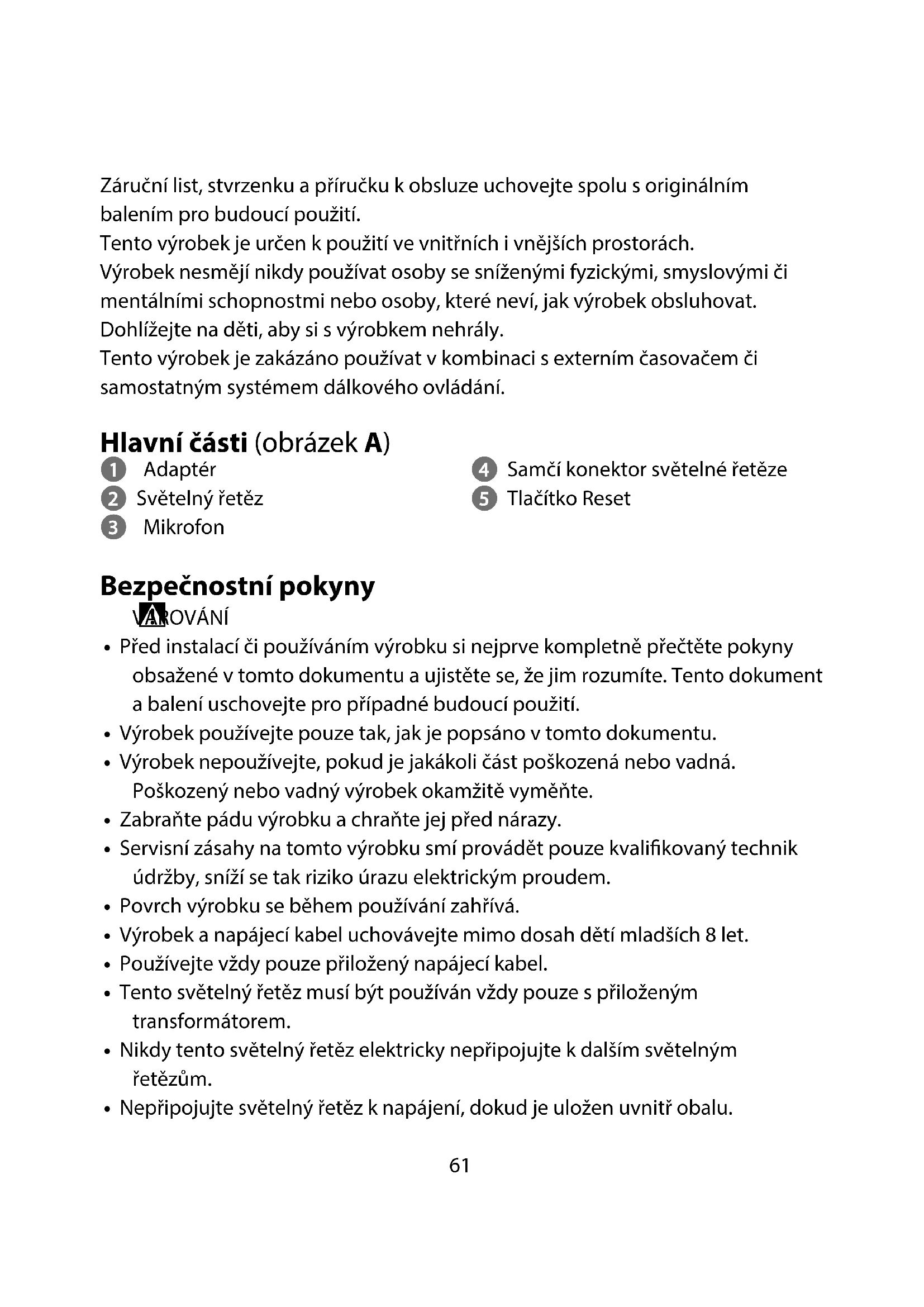 - Tento světelný řetěz musí být používán vždy pouze s přiloženým transformátorem.