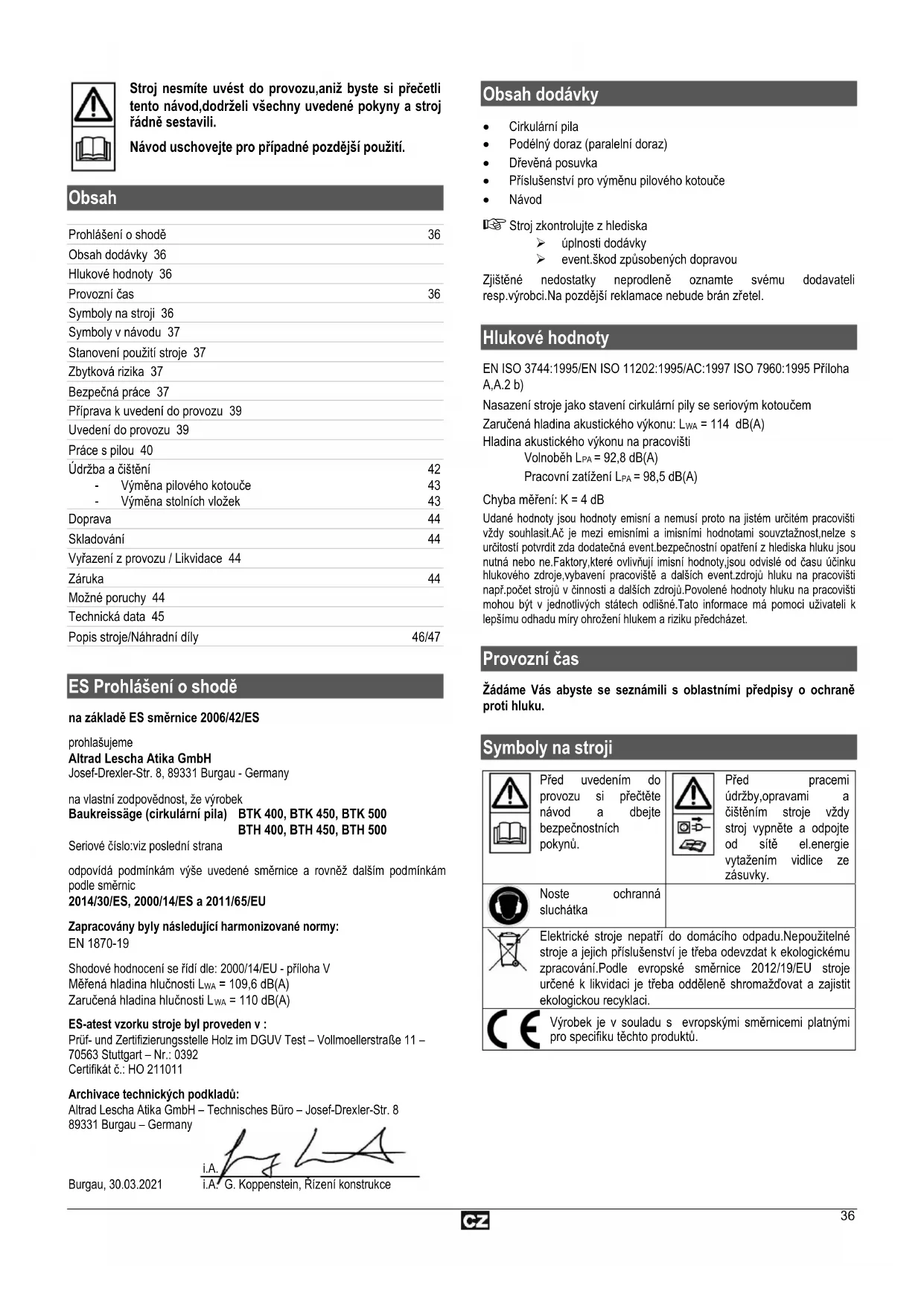 ES Prohlášení o shodě na základě ES směrnice 2006/42/ES prohlašujeme Altrad Lescha Atika GmbH Josef-Drexler-Str. 8, 89331 Burgau - Germany na vlastní zodpovědnost, že výrobek Baukreissäge (cirkulární pila) BTK 400, BTK 450, BTK 500