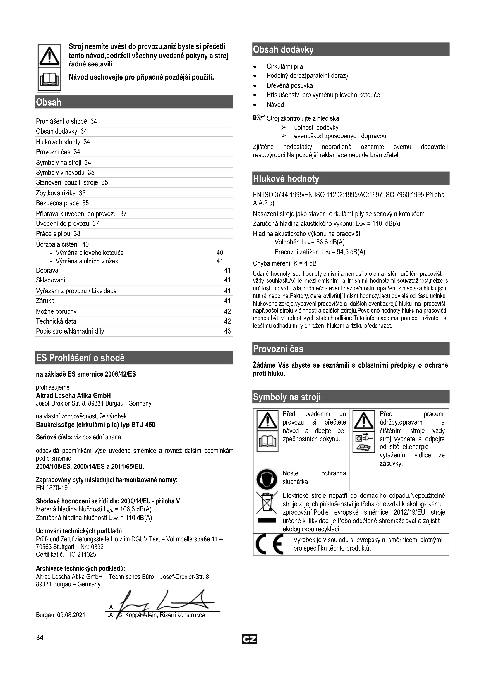 BTU 450 - Pila ATIKA - Bezplatný návod k obsluze