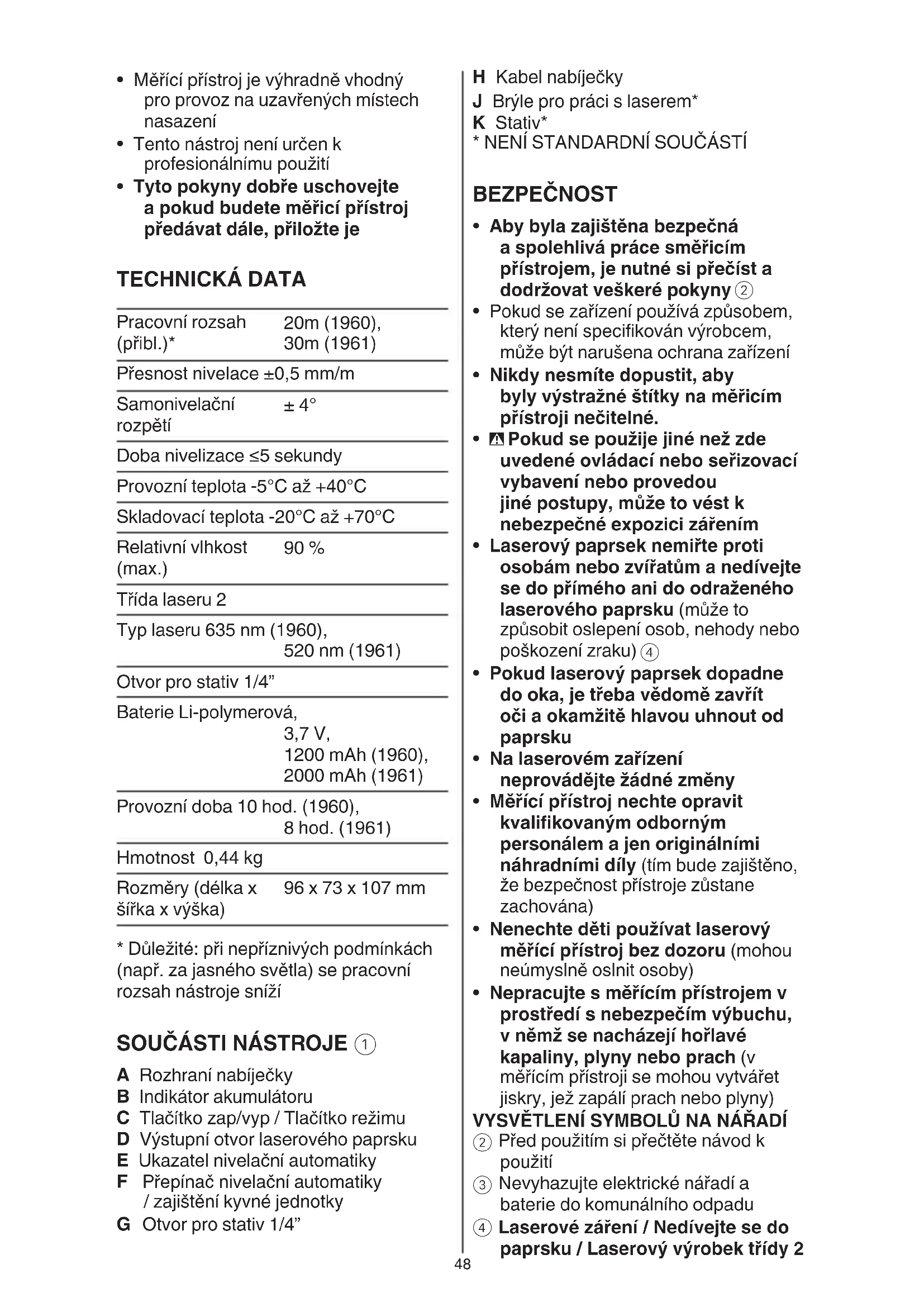 - Tyto pokyny dobře uschovejte a pokud budete měřicí přístroj předávat dále, přiložte je TECHNICKÁ DATA Pracovní rozsah (přibl.)* 20m (1960), 30m (1961) Přesnost nivelace ±0,5 mm/m Samonivelační rozpětí ± 4° Doba nivelizace ≤5 sekundy Provozní teplota -5°C až +40°C Skladovací teplota -20°C až +70°C Relativní vlhkost (max.) 90 % Třída laseru 2 Typ laseru 635 nm (1960), 520 nm (1961) Otvor pro stativ 1/4” Baterie Li-polymerová, 3,7 V, 1200 mAh (1960), 2000 mAh (1961) Provozní doba 10 hod. (1960), 8 hod. (1961) Hmotnost 0,44 kg Rozměry (délka x šířka x výška) 96 x 73 x 107 mm