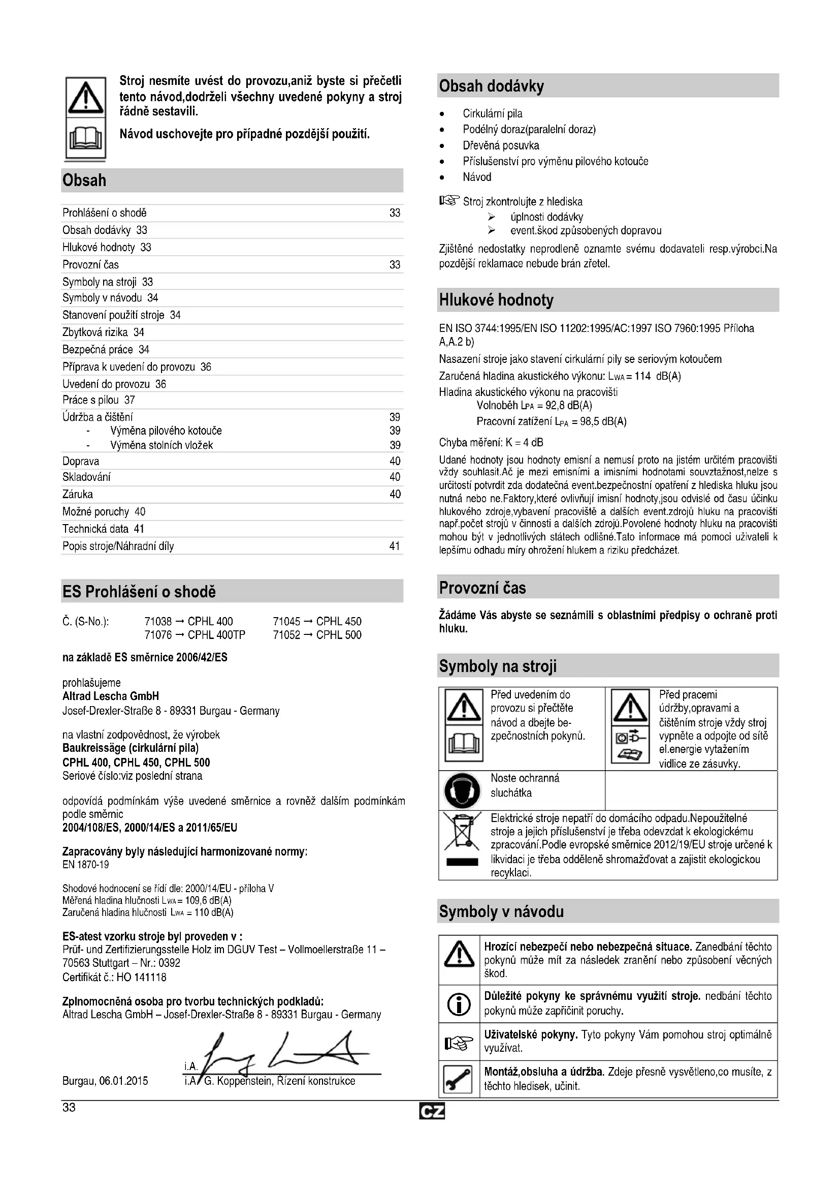 na základě ES směrnice 2006/42/ES prohlašujeme Altrad Lescha GmbH Josef-Drexler-Straße 8 - 89331 Burgau - Germany na vlastní zodpovědnost, že výrobek Baukreissäge (cirkulární pila)