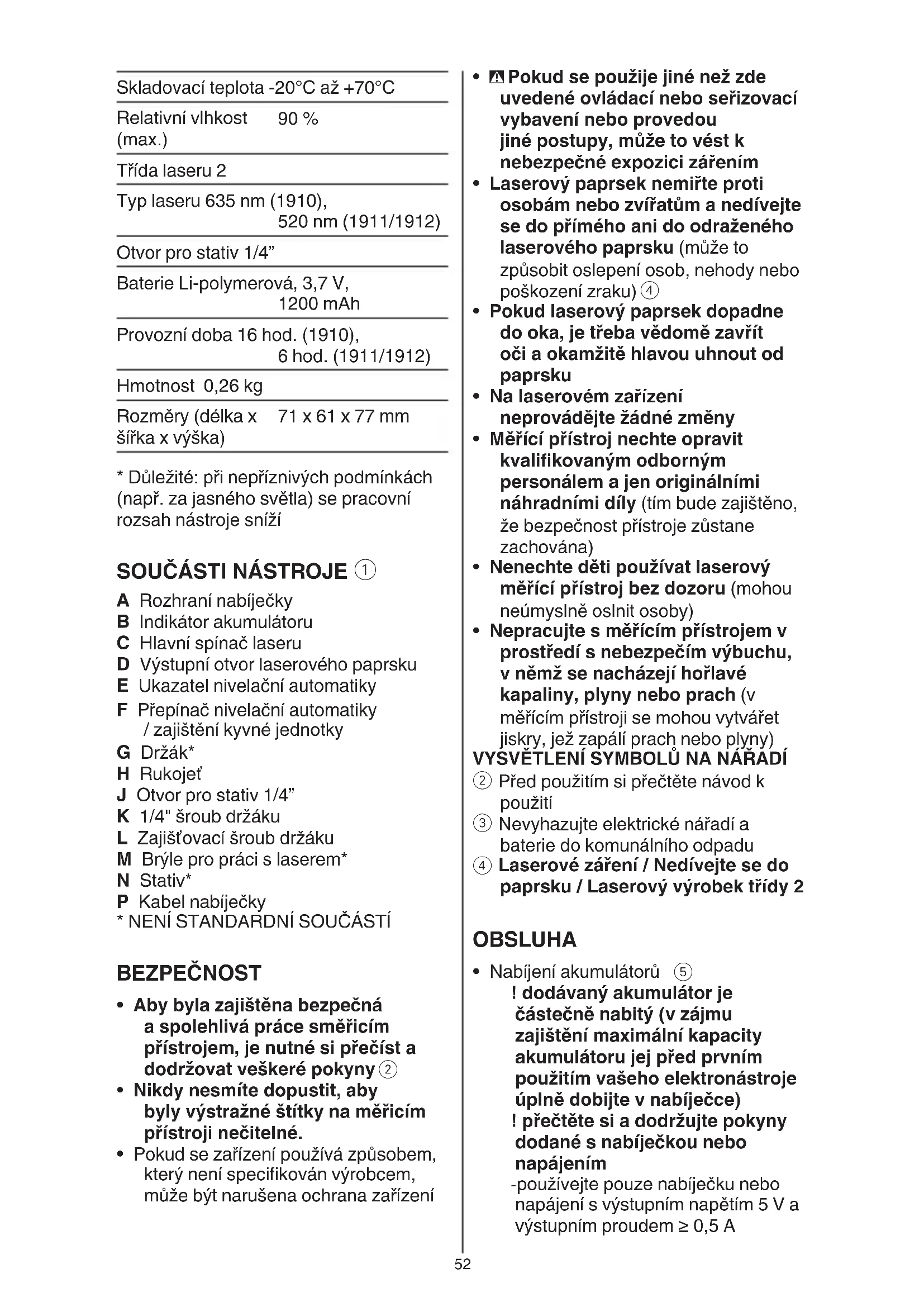 ! dodávaný akumulátor je částečně nabitý (v zájmu zajištění maximální kapacity akumulátoru jej před prvním použitím vašeho elektronástroje úplně dobijte v nabíječce) ! přečtěte si a dodržujte pokyny dodané s nabíječkou nebo napájením - používejte pouze nabíječku nebo napájení s výstupním napětím 5 V a výstupním proudem ≥ 0,5 A Skladovací teplota -20°C až +70°C Relativní vlhkost (max.) 90 % Třída laseru 2 Typ laseru 635 nm (1910), 520 nm (1911/1912) Otvor pro stativ 1/4” Baterie Li-polymerová, 3,7 V, 1200 mAh Provozní doba 16 hod. (1910), 6 hod. (1911/1912) Hmotnost 0,26 kg Rozměry (délka x šířka x výška) 71 x 61 x 77 mm