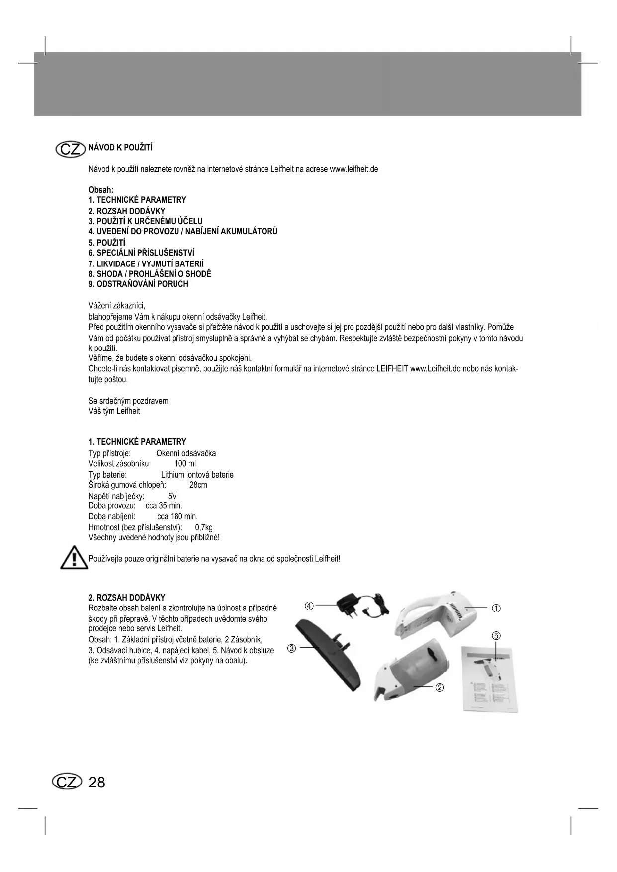 Váženízákazníci, blahopřejemeVámknákupuokenníodsávačkyLeifheit. Předpoužitímokenníhovysavačesipřečtětenávodkpoužitíauschovejtesijejpropozdějšípoužitíneboprodalšívlastníky.Pomůže Vámodpočátkupoužívatpřístrojsmysluplněasprávněavyhýbatsechybám.Respektujtezvláštěbezpečnostnípokynyvtomtonávodu kpoužití. Věříme,žebudetesokenníodsávačkouspokojeni. Chcete-lináskontaktovatpísemně,použijtenáškontaktníformulářnainternetovéstránceLEIFHEITwww.Leifheit.denebonáskontak- tujtepoštou. Sesrdečnýmpozdravem VáštýmLeifheit 1.TECHNICKÉPARAMETRY Typpřístroje: Okenníodsávačka Velikostzásobníku: 100ml Typbaterie: Lithiumiontovábaterie Širokágumováchlopeň: 28cm Napětínabíječky: 5V Doba provozu: cca 35 min. Dobanabíjení: cca180min. Hmotnost(bezpříslušenství): 0,7kg Všechnyuvedenéhodnotyjsoupřibližné! PoužívejtepouzeoriginálníbaterienavysavačnaoknaodspolečnostiLeifheit!