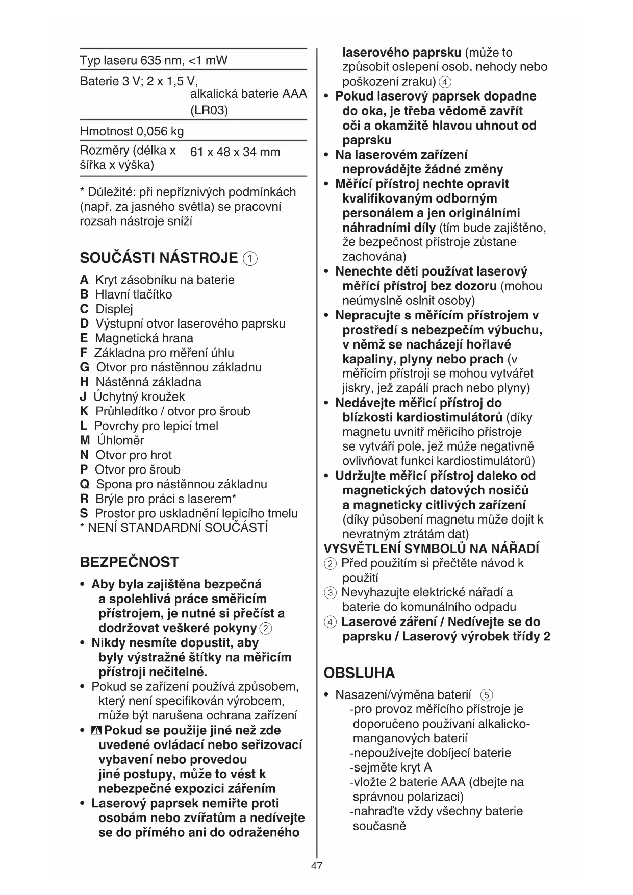 - Tento nástroj je určen pro vyrovnávání předmětů anebo označování požadovaných linií řezů pomocí přímého promítání laserového paprsku; pomocí dodaného příslušenství lze nástroj použít pro mnoho povrchů
