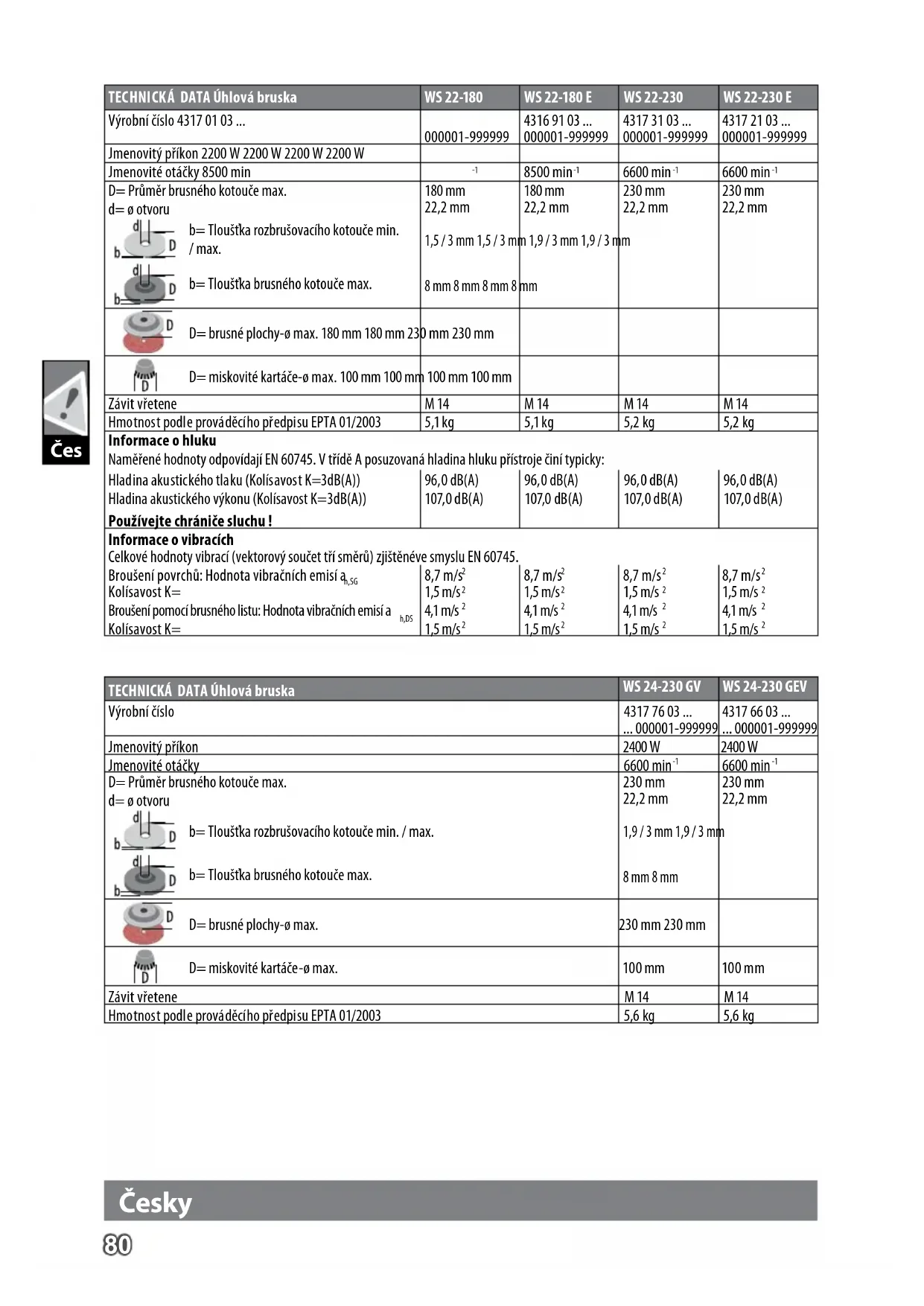 D= Průměr brusného kotouče max. d= ø otvoru 180 mm 22,2 mm 180 mm 22,2 mm 230 mm 22,2 mm 230 mm 22,2 mm b= Tloušťka rozbrušovacího kotouče min. / max. 1,5 / 3 mm 1,5 / 3 mm 1,9 / 3 mm 1,9 / 3 mm b= Tloušťka brusného kotouče max. 8 mm 8 mm 8 mm 8 mm D= brusné plochy-ø max. 180 mm 180 mm 230 mm 230 mm D= miskovité kartáče-ø max. 100 mm 100 mm 100 mm 100 mm Závit vřetene M 14 M 14 M 14 M 14 Hmotnost podle prováděcího předpisu EPTA 01/2003 5,1 kg 5,1 kg 5,2 kg 5,2 kg Informace o hluku Naměřené hodnoty odpovídají EN 60745. V třídě A posuzovaná hladina hluku přístroje činí typicky: Hladina akustického tlaku (Kolísavost K=3dB(A)) 96,0 dB(A) 96,0 dB(A) 96,0 dB(A) 96,0 dB(A) Hladina akustického výkonu (Kolísavost K=3dB(A)) Používejte chrániče sluchu ! 107,0 dB(A) 107,0 dB(A) 107,0 dB(A) 107,0 dB(A) Informace o vibracích Celkové hodnoty vibrací (vektorový součet tří směrů) zjištěnéve smyslu EN 60745. Broušení povrchů: Hodnota vibračních emisí a h,SG Kolísavost K= 8,7 m/s
